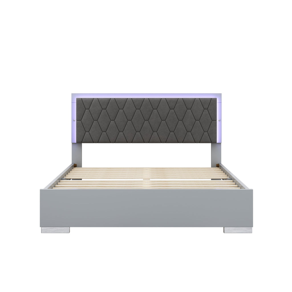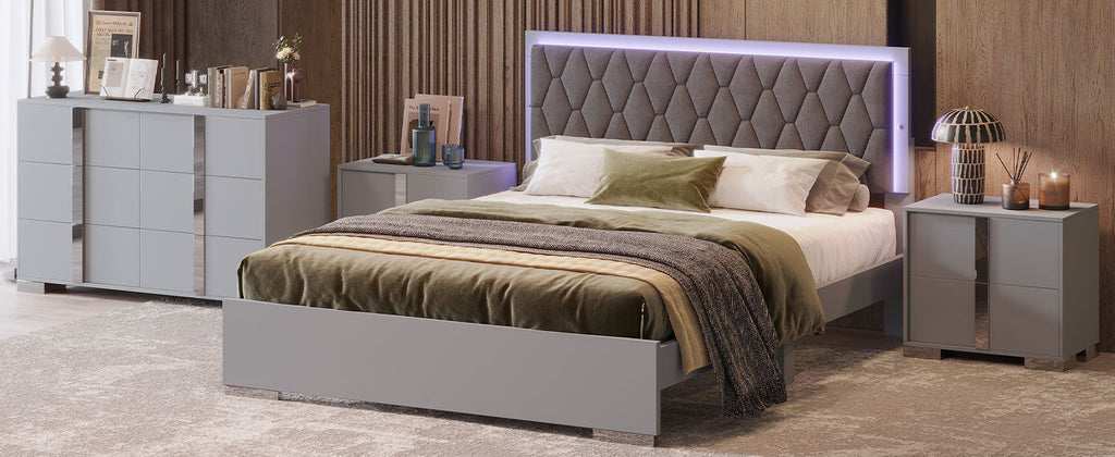 - 4-Pieces Perfect Bedroom Set: 1 queen size bed + 2 bedside tables + a chest of drawers. The modern and simple design fits the decoration style of most families. Mirror design + LED lights create a warm sleeping environment.