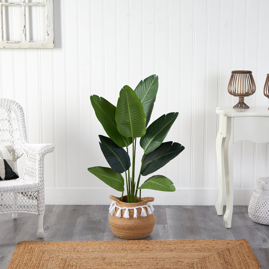 4’ Travelers Palm Artificial Tree in Boho Chic Handmade Natural Cotton Woven Planter with Tassels