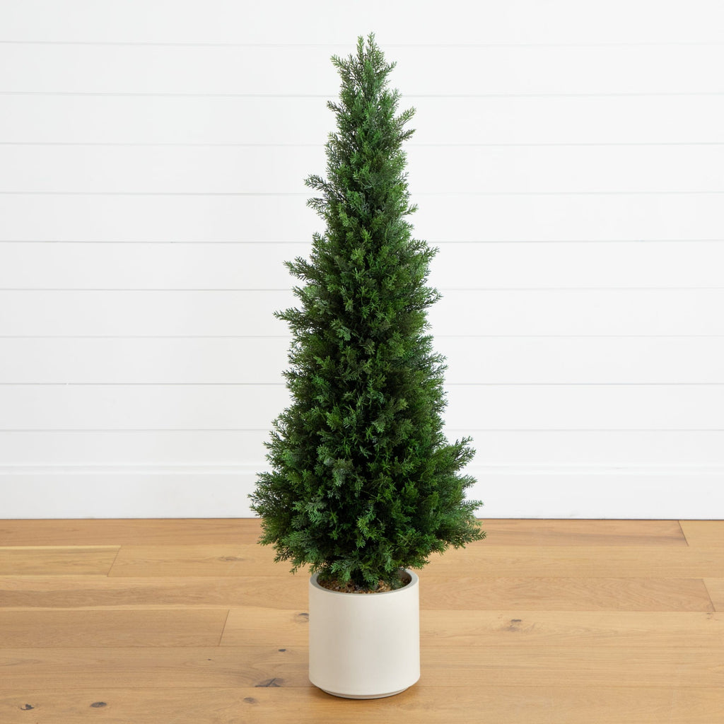 bring the best of the Pacific Northwest's dreamy forests with the artificial cedar tree. Inspired by the dreamy lush landscape, this cedar has lifelike leaves that look real. Crafted from high-quality materials, bend the branches to fit in your space for a custom look. Manufactured through a special, secret process, this piece is safe for outdoor use, display under a covered surface for longevity. Standing 4' from a white planter, you'll faux for this piece. Great for patios, porches, entryways and more. *Bring inside during inclement weather.