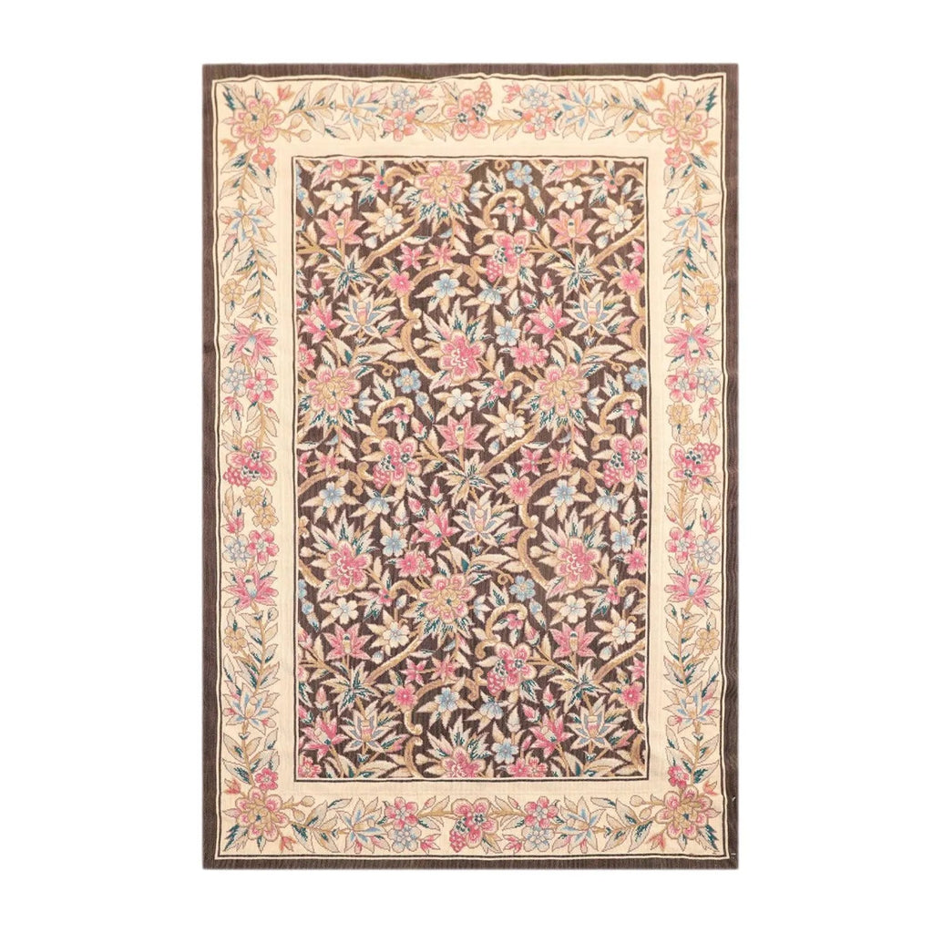 This is a beautiful Brown, Beige, Pink, Blue, Tan, Multi Color Hand Knotted French Aubusson Needlepoint Area Rug Wool Rug. Its elegant style is easy to decorate with and perfect for living room, dining room, bed room or anywhere in the residence or office. This Aubusson is 100% wool in thin pile. Rugs and tapestries were made famous during 14th and 15th century and were made in Aubusson, a small medieval town in France. The rugs have motifs in traditional design. During 1930s tapestry was made popular by artists such as Cocteau, Dufy, Dali, Braque, Calder and Picasso who were invited to Aubusson to express themselves through the medium of wool.