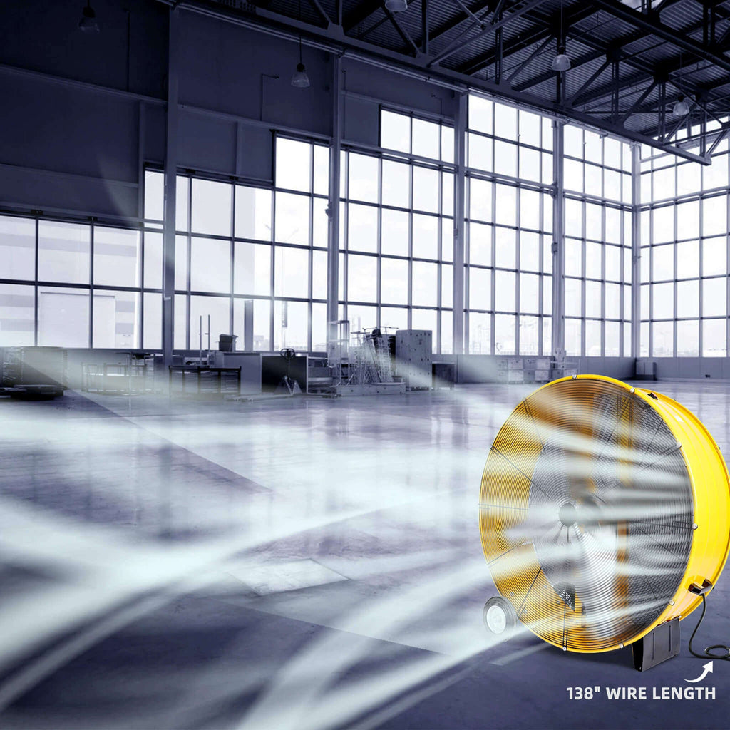 - With its portable design and mobility, you can easily move the fan wherever it’s needed most, whether it’s in a workshop, warehouse, or garage.