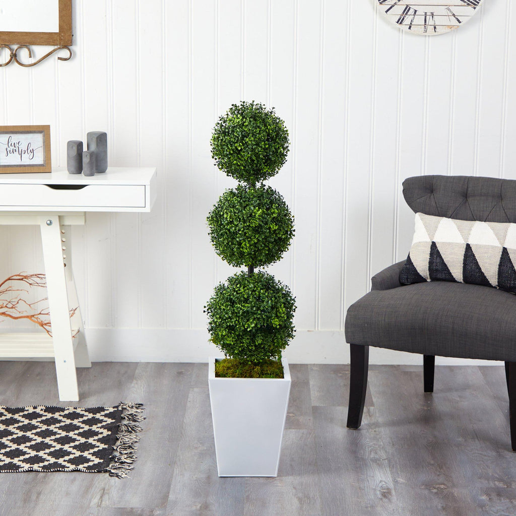 Elegantly greet guests with this triple boxwood topiary. Three perfectly trimmed boxwood balls sit in synergy and are made of realistic-looking boxwood foliage. You can now enjoy the sophistication of the boxwood without maintenance or care. Standing 46" from a white planter (included in height), curate in compact spaces. Perfect for an apartment, bathroom, room corner, or foyer.