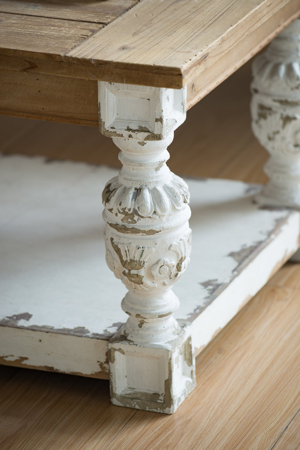 The lovely Alcott Coffee Table features a vintage style that would look at home in any sunny countryside cottage. The durable fir wood top is sure to lend a sense of warmth to any space, while the weathered whitewashed body gives this piece the appeal of a treasured heirloom. A spacious bottom shelf offers plenty of space for storage baskets or decorations.