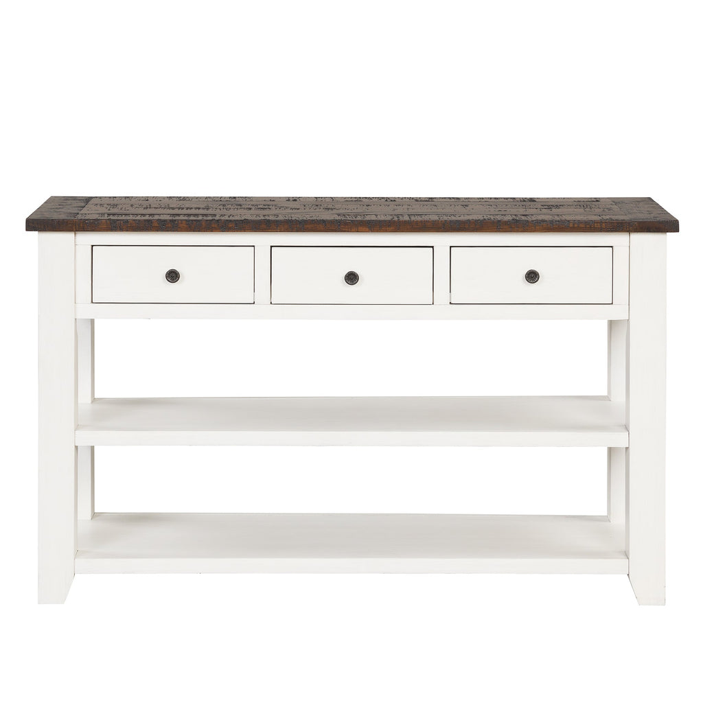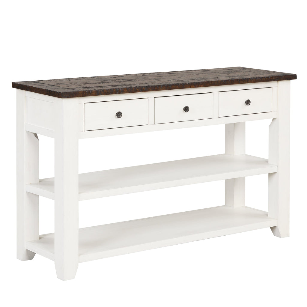 48" Solid Pine Wood Top Console Table, Modern Entryway Sofa Side Table with 3 Storage Drawers and 2 Shelves. Easy to Assemble (Antique White+ Brown Top)