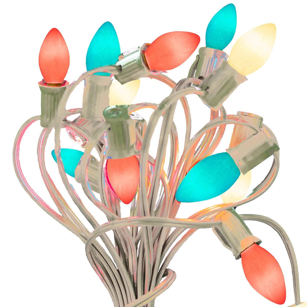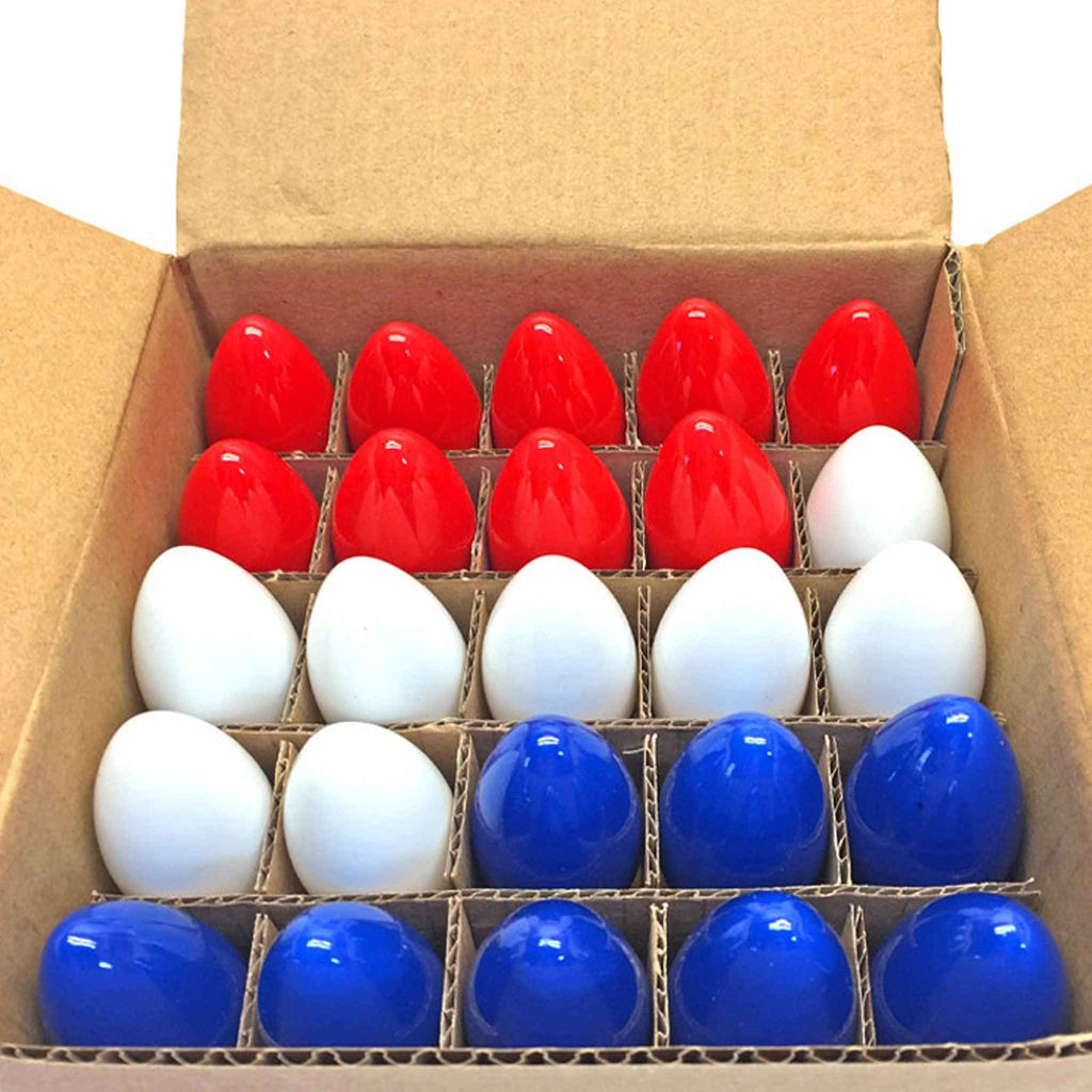Get 25 Transparent Red, White, and Blue Incandescent Light Bulbs with a 25FT White Patio String Cord.