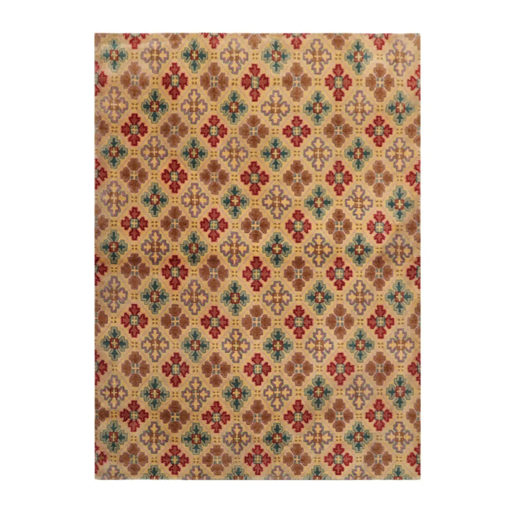 Story Behind the Art For centuries Tibetans have used rugs for decorative and functional purposes, drawing upon geometric patterns, auspicious symbols, real and mythical animals, and natural imagery to create beautiful, colorful designs. But it was only after 1959 with the Chinese invasion of Tibet and the growth of Tibetan diaspora in Nepal and Tibet that Tibetan rug weaving underwent a crucial commercial revival. In the 1970s, Tibetan rugs rose to prominence and Nepalese artisans, drafted in to keep up with the rising demand, became the mainstay of the Tibetan rug weaving traditions. While either Turkish knot or the Persian knot (Senneh knot) is used to create the pile or depth of a rug in most of Asia, the Tibetan rug utilizes a slit-loop technique called the Tibetan knot. Here rugs are woven by wrapping a continues length of yarn over a rod laid across the warps stretched on the loom. When the rod has been wrapped for its entire length, a knife is slid along the rod, cutting the wrapped yarn into two rows of pile tufts. The resultant pile is a wonderful mix of depth, texture and richness. Traditional Tibetan rug motifs generally reflect the importance of Buddhist religion in Tibetan art and culture. Many design elements of Chinese origin like the phoenix, dragon, and lotus symbols alongside motifs from Chinese decorative tradition have also been assimilated in the rug repertoire of this region. In modern times, designs featured in Tibetan, Nepalese rugs (those woven by Tibetan refugees in Nepal) and Indo-Tibetans (woven in India) range from Westernized adaptations of traditional Tibetan motifs (such as branching floral designs and snow lions) to a large mixture of foreign and modern free-form patterns.