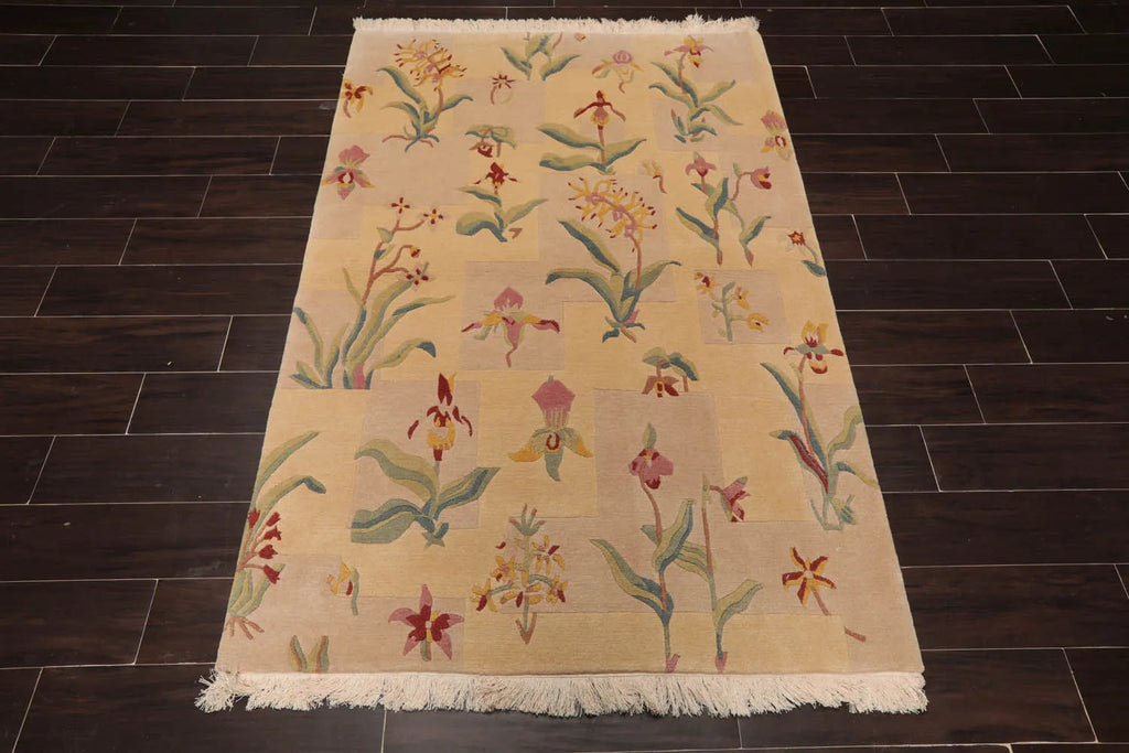4x6 Beige Hand Knotted Tibetan Transitional Floral Wool Oriental Area Rug