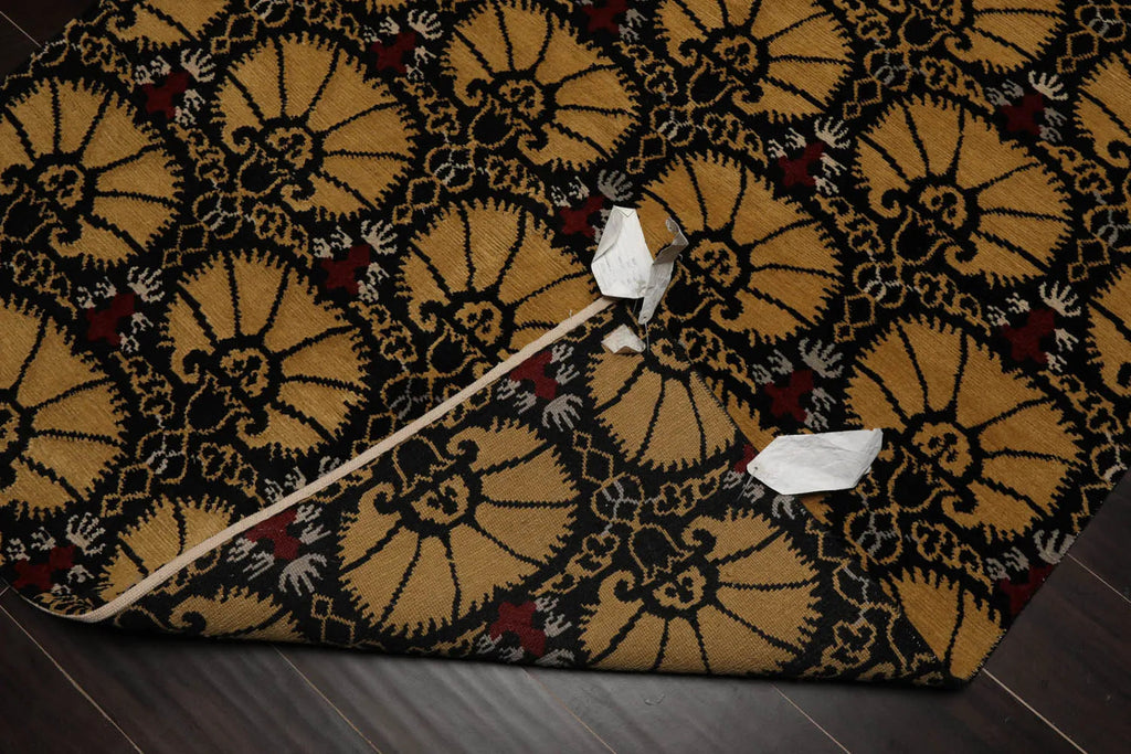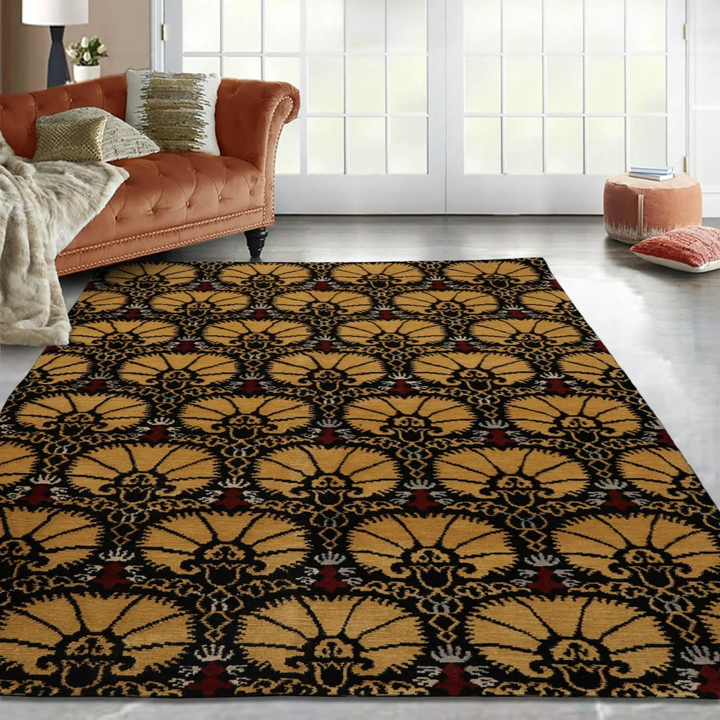 This is a beautiful Black, Gold, Rust, Green, Multi Hand Knotted Tibetan Art Deco Wool rug. The wool not only adds to rug's durability, but also provides dirt repelling quality and thermal insulation. Art Deco rugs primarily reflect innovations in modern European decorative arts during the early twentieth century. This rug is pattern heavy in the manner of more decorative Art Deco rugs. The overall impression is one of glamor and sophistication.
