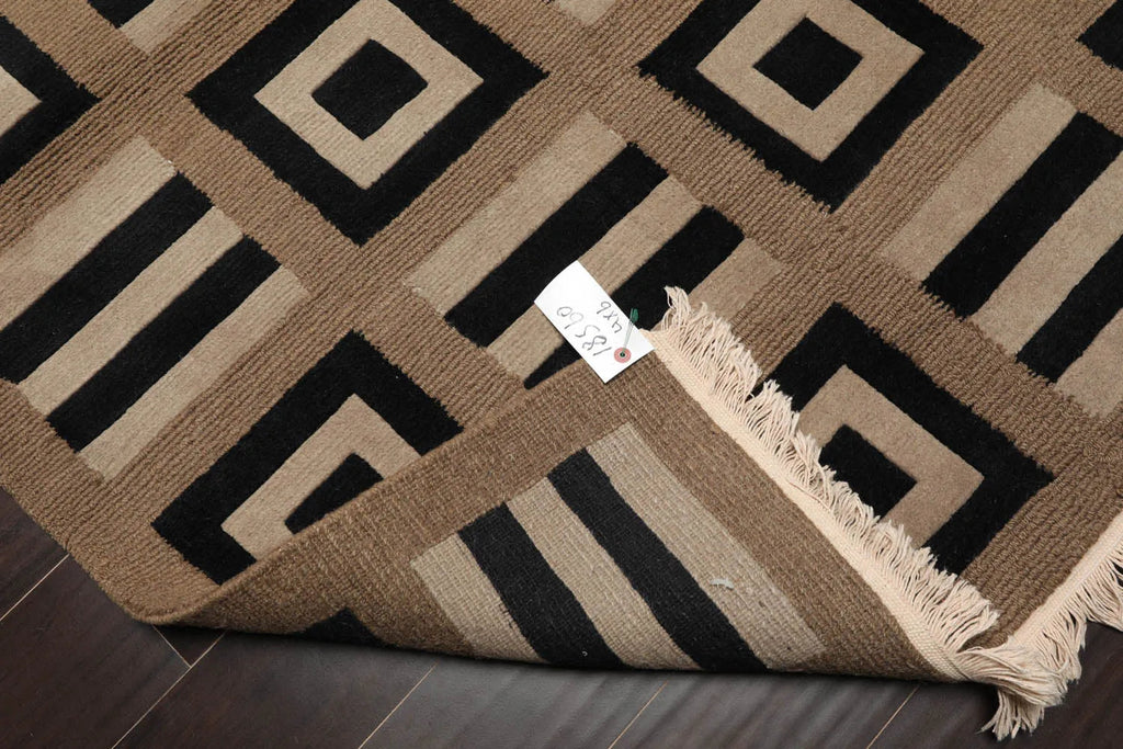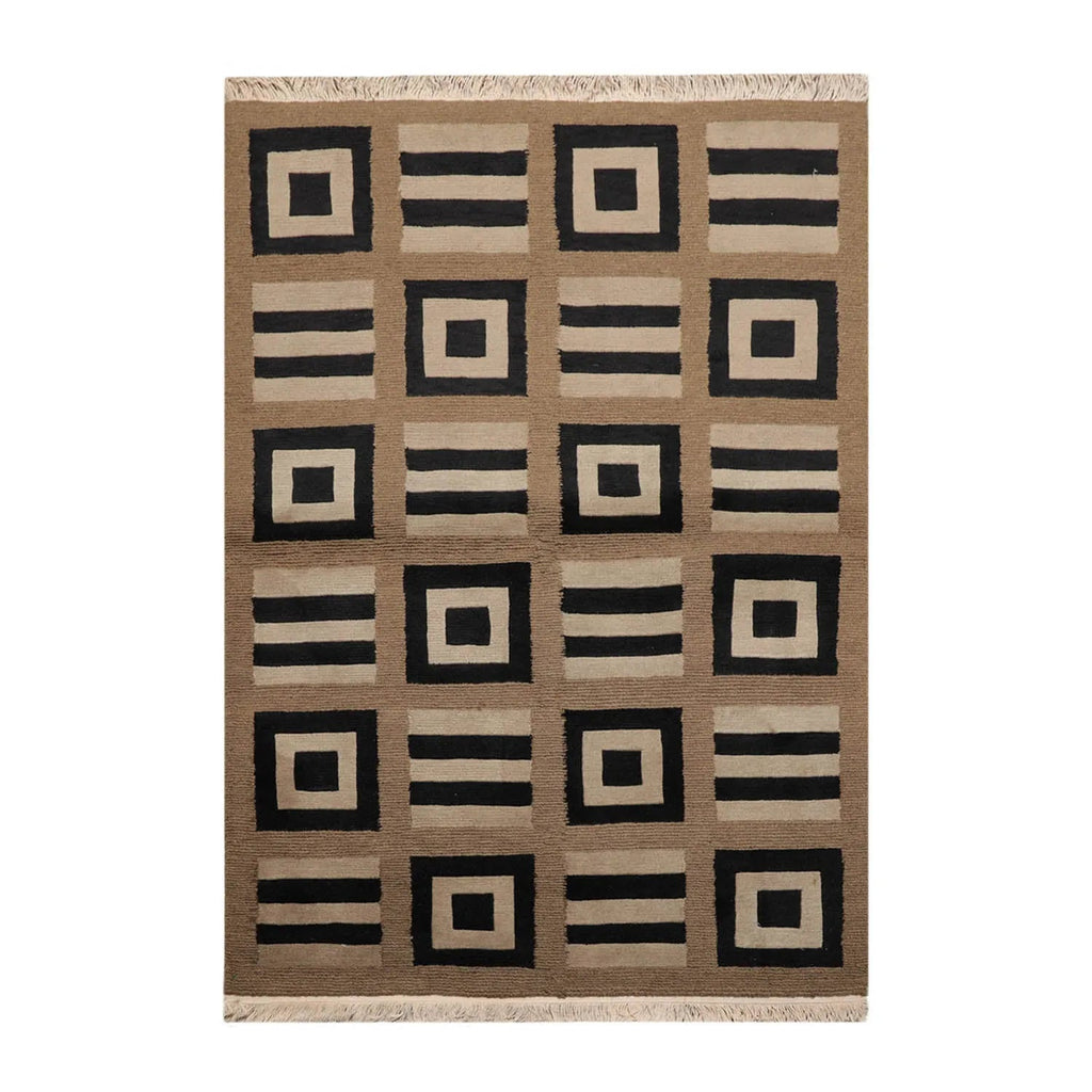 Before you is a beautiful hand knotted Tibetan wool rug from Nepal. The wool not only adds to rug's durability, but also provides dirt repelling quality and thermal insulation. The rug's design with strong geometric undertones adds instant drama to the floors. With an earthy color palette,the rug is primed to add glamor and finesse to your home interiors.