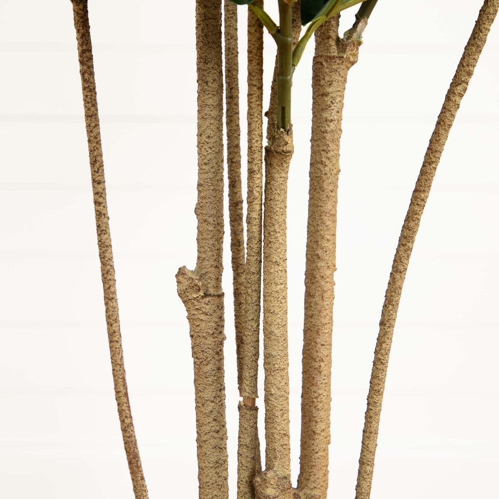 The impressive Oak Artificial Tree will make a grand entrance in any home. Large, glossy, variegated leaves with naturally occurring red detail in the center stem from thin trunks for a medley of green foliage. This fake tree is UV resistant, and you can place it outdoor safely. Standing 5.5' from a nursery planter, DIY and pair with your favorite pot. For a jungle look, put it in your backyard, foyer, or entryway.