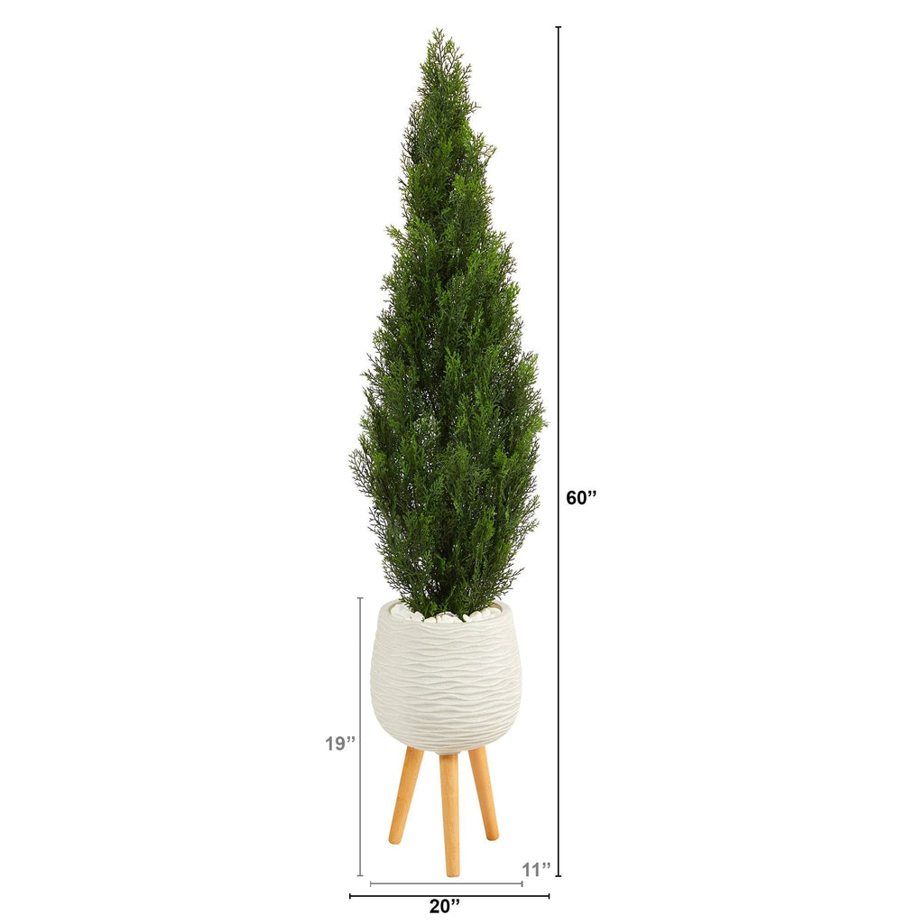 Bring the serenity of the outdoors to your space with this Cedar Artificial Tree. The green, bushy foliage creates a vertical focal point that complements many style decors. Recreate the look of a crisp, morning walk through a western national park. Standing 5β from a white tripod planter, design in tight spaces that need a little greenery. Perfect for apartments, awkward corners, bedrooms, and foyers.
