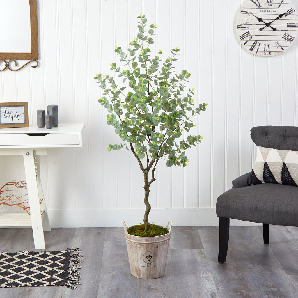 Spread the calmness of this fine Eucalyptus Artificial Tree throughout your living areas. The airy Eucalyptus leaves, known for their medicinal benefits, form a delicate palette of refined beauty. Light-hued leaves in the center of the bunch stemming from a thin, brown trunk bring contrasting colors and texture to all spaces. Standing 5' from a farmhouse planter (included in height), curate in areas that need a soft touch. Perfect for living rooms, hallways, and bedrooms.