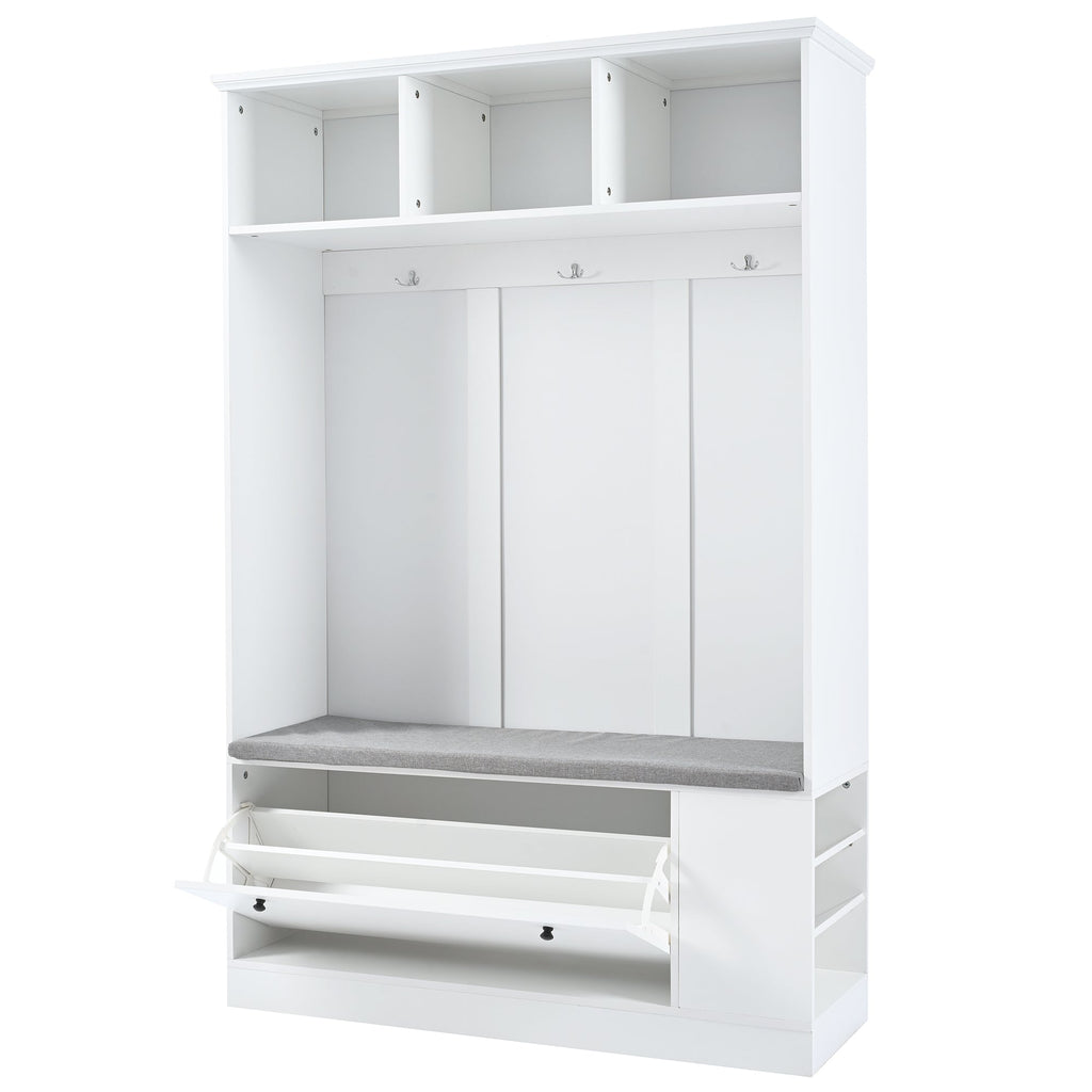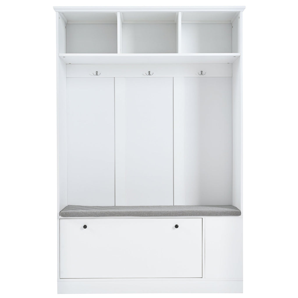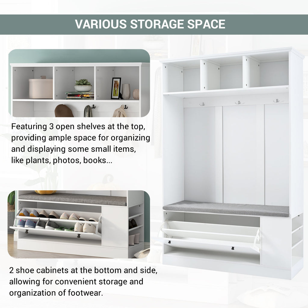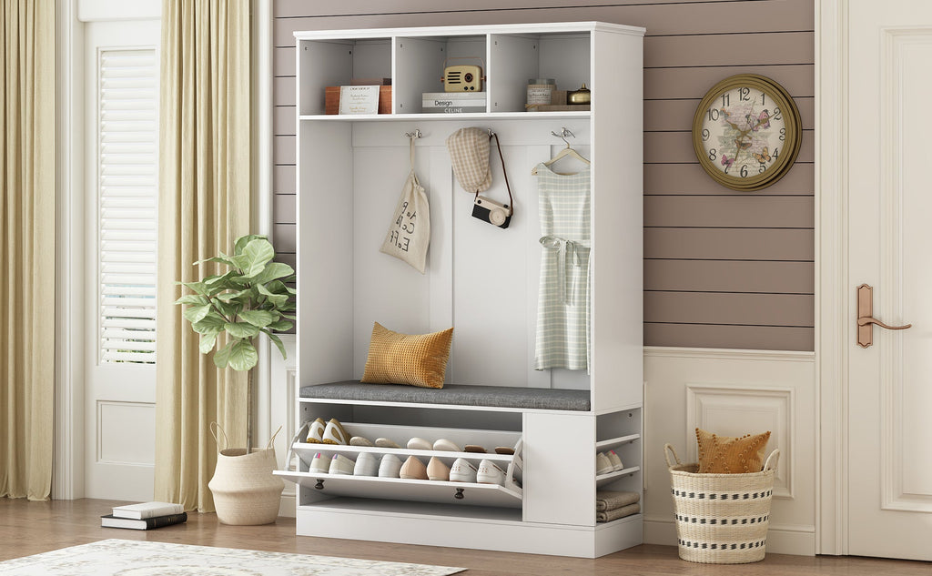 For a beautiful and properly organized foyer, entryway or mudroom, nothing beats the effectiveness of this beautiful multifunctional hall tree with storage bench.This versatile hall tree comes has 3-open cubbies at the top for displaying small items, and two different style compartments at the bottom and right side for storing shoes.The rustic, slatted back features three metal hooks for hanging bags, hats and coats. And this hall tree also has a comfortable bench with thick cushion, perfect for your entryway, living room and mudroom.