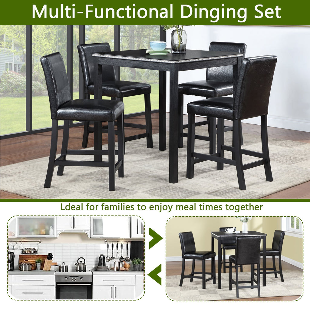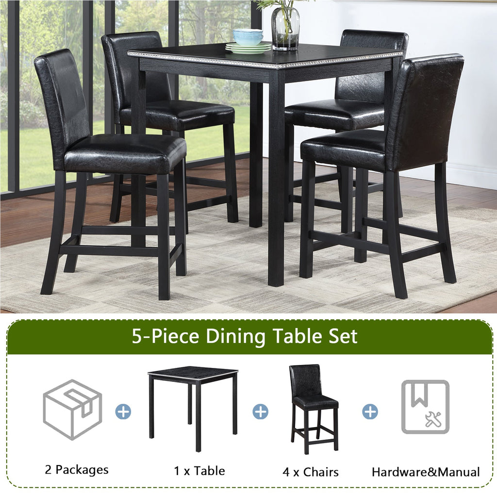 Enhance your dining area with this 5-piece dining set, comprising a chic counter height dining table and four upholstered dining chairs. The table top is square-shaped and boasts a robust solid wood frame and legs, ensuring long-lasting durability and stability. The faux natural wood grain table top, made from MDF, adds warmth and character to the space. The set includes four comfortable upholstered chairs, providing the perfect dining experience. The dining chairs are a perfect blend of functionality and style, making them an ideal addition to any dining space. They are available in black, white, and grey, each of which matches your home's decor perfectly.