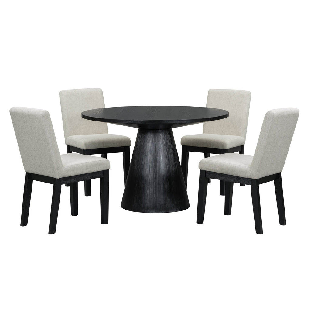 - This 5-piece dining set includes a table and four chairs. The unique table shape design makes it more decorative, simple never out of exquisite, and perfectly blends modernity and retro. You can put it in the dining room or living room.