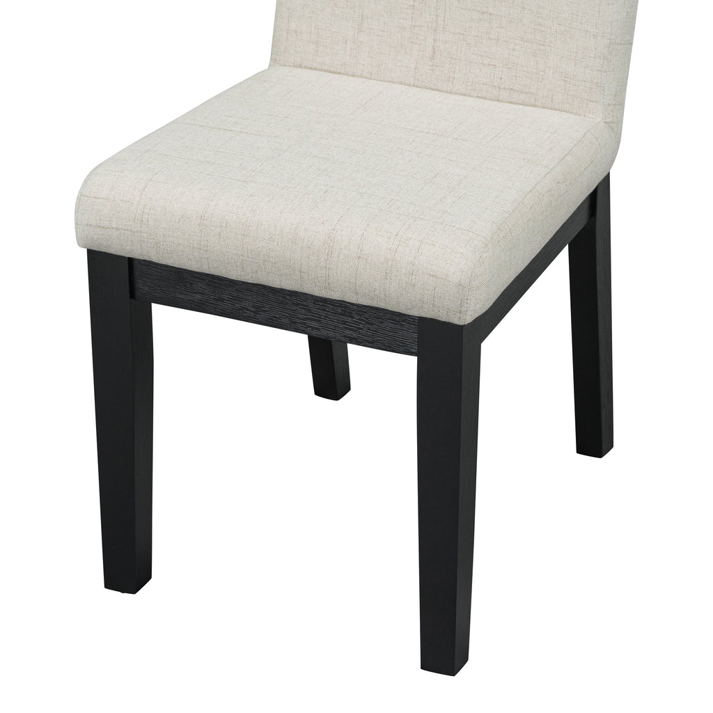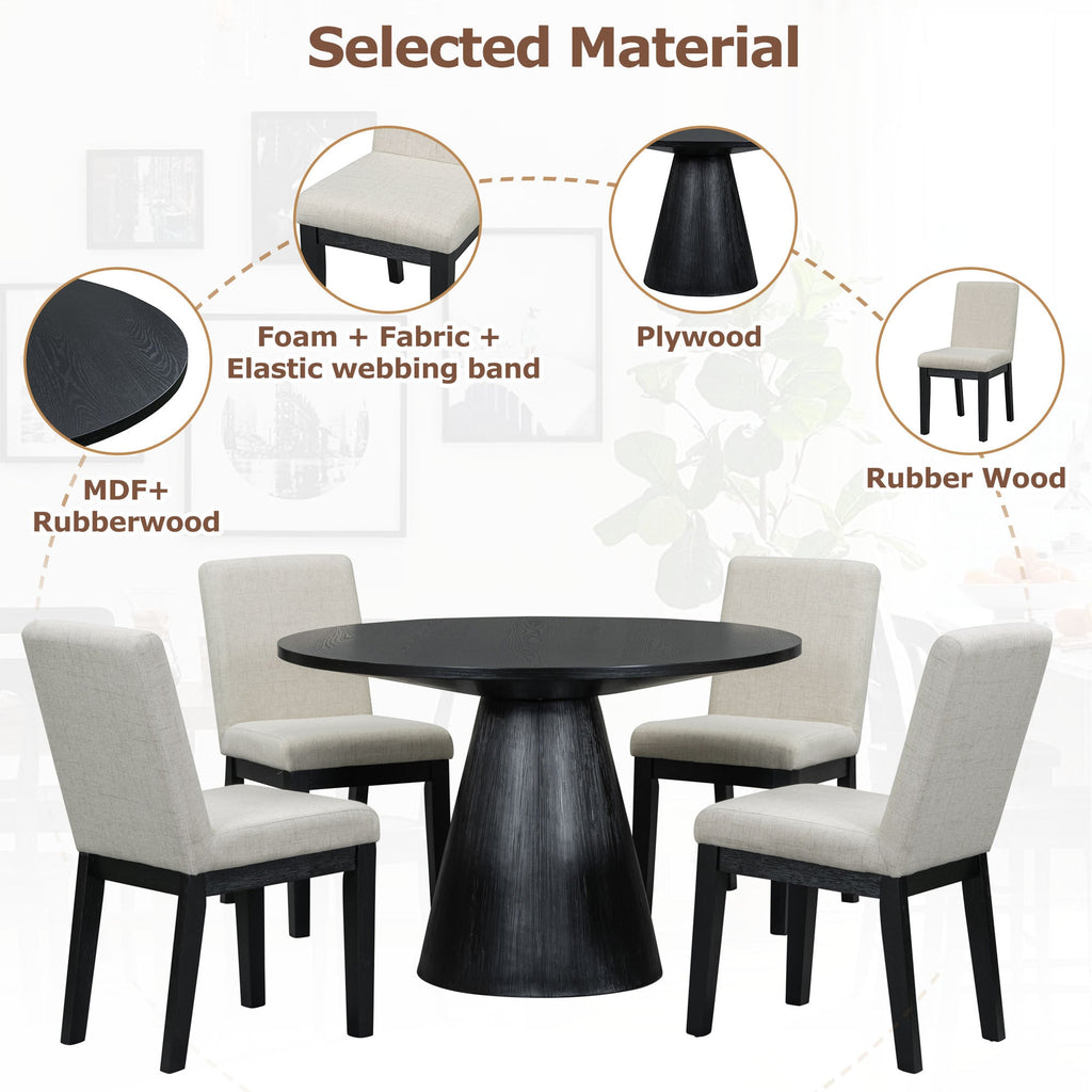 Round table top without pattern, and with the frustum table legs. Two simple parts form a complete table. The chair has an upholstered and upholstered back, which are ergonomic and provide you with a more comfortable sitting experience. The tabletop is made of MDF+rubberwood, and the table legs are made of plywood to ensure stability and support. The frame of the chair is also made of rubber wood, and the cushion is composed of Foam + Fabric + Elastic webbing band.