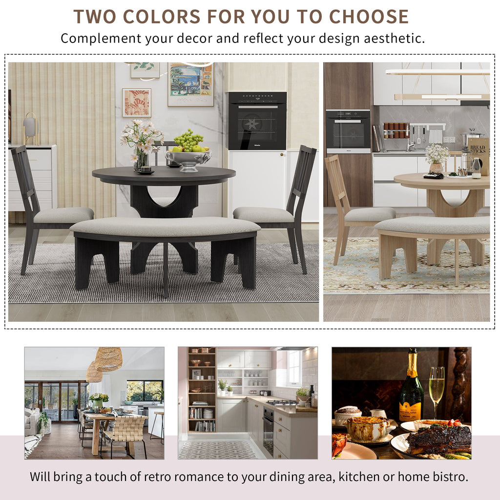 This is a 5-piece retro classic dining table set, including 1 round table, 3 upholstered chairs and a curved bench.This round table is made of MDF and solid wood veneer with a clear natural brushed finish on the top. Legs and frame are made of high quality rubber wood. Plinth-style legs provide excellent durability and stability. Plastic feet are installed at the bottom of the table legs to protect your floor.