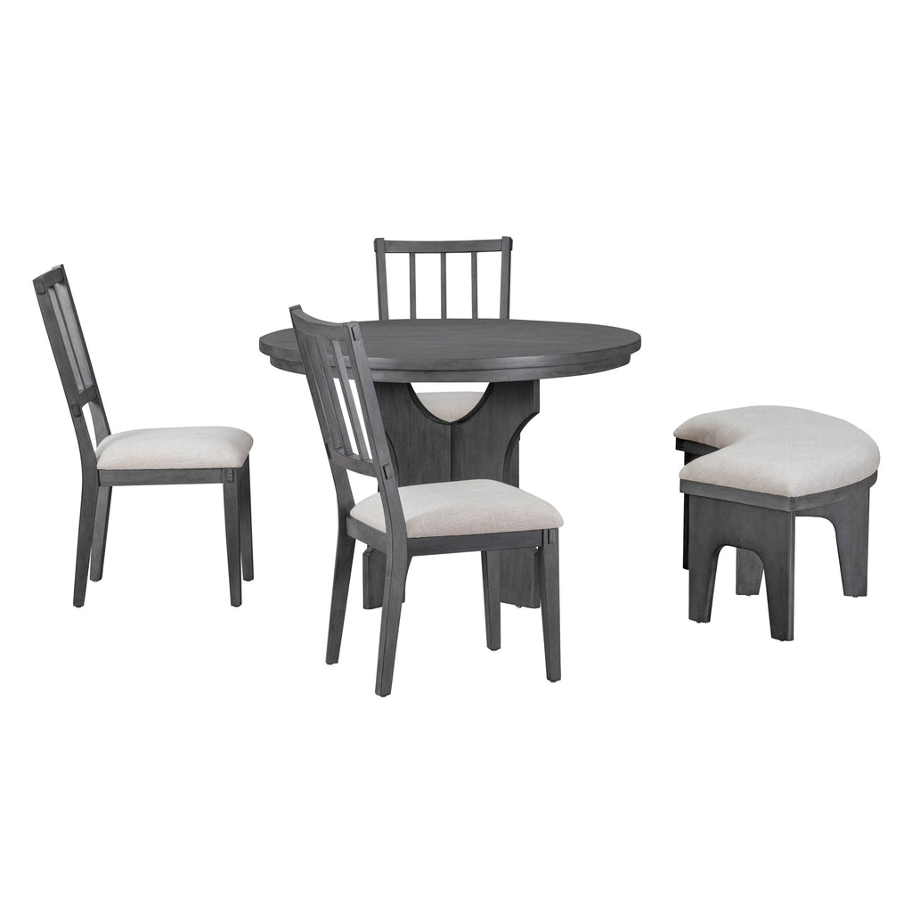 - This is a 5-piece retro classic dining table set, including 1 round table, 3 upholstered chairs and a curved bench. The round dining table set with such a compact design makes the most of your living space, the bench and chairs fit nicely under the table without taking up extra space. The lack of sharp corners on the tabletop also ensures safety for both children and the elderly in your family.
