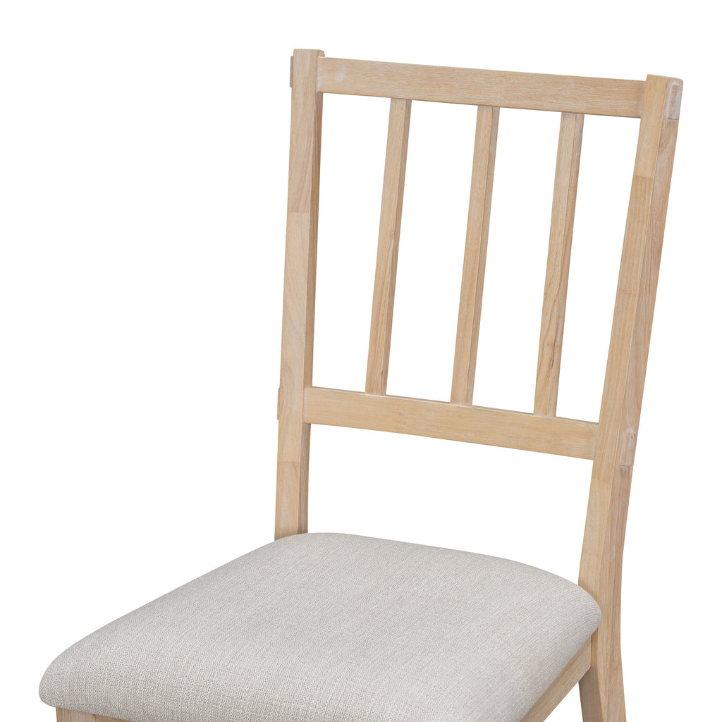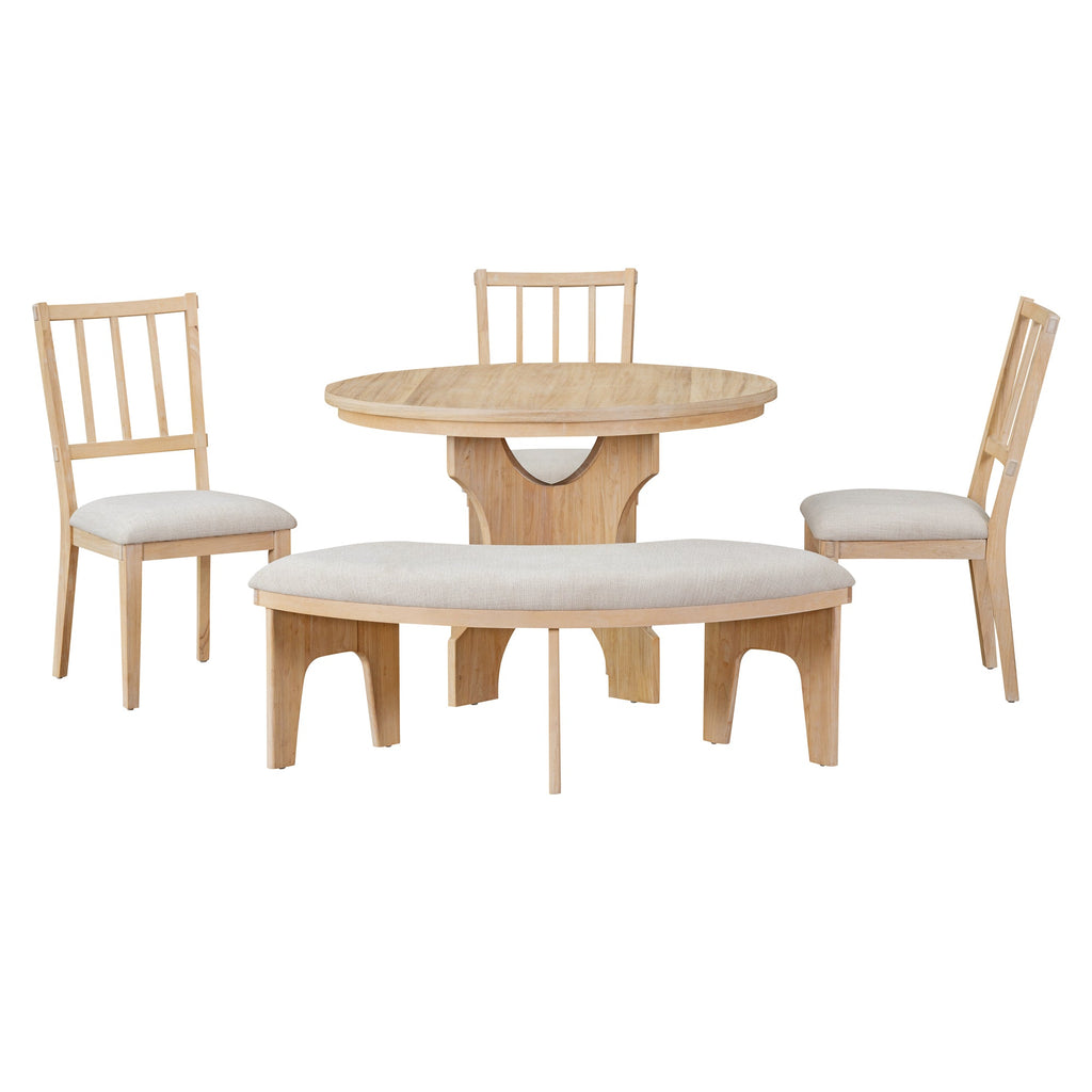 This is a 5-piece retro classic dining table set, including 1 round table, 3 upholstered chairs and a curved bench.This round table is made of MDF and solid wood veneer with a clear natural brushed finish on the top. Legs and frame are made of high quality rubber wood. Plinth-style legs provide excellent durability and stability. Plastic feet are installed at the bottom of the table legs to protect your floor.