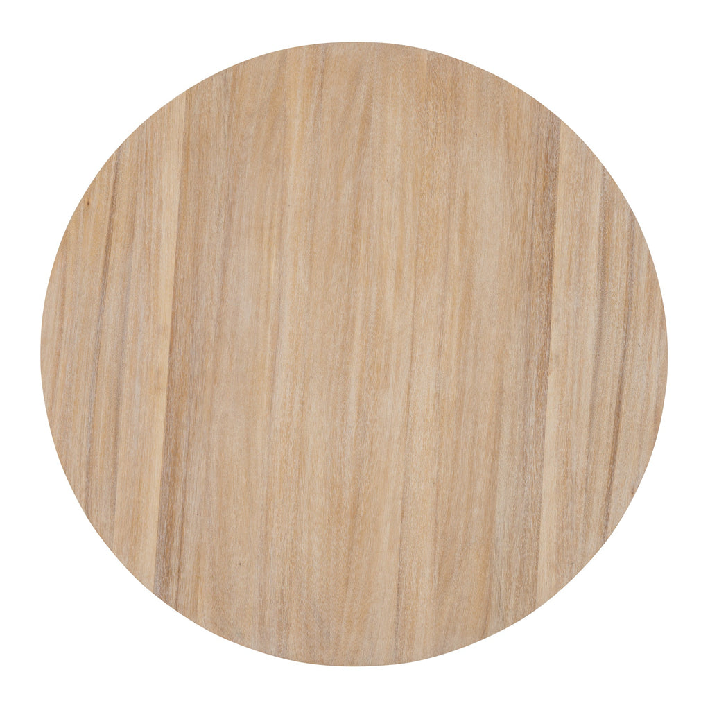 - This round table is made of MDF and solid wood veneer with a clear natural brushed finish on the top. Legs and frame are made of high quality rubber wood. Plinth-style legs provide excellent durability and stability. Plastic feet are installed at the bottom of the table legs to protect your floor.