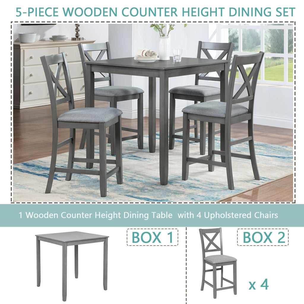 This 5 piece solid wood counter height dining set consists of a square table and 4 upholstered chairs. The table top is spacious and square and the slender tapered legs are both sturdy and flexible. With its sleek contemporary style and clean lines, this dining set is ideal for any dining room. The water and oil resistant high quality MDF and birch veneer makes it easy to clean with a simple wipe. The frame and legs are made from durable, high quality solid wood. The dining chairs feature a comfortable X-shaped backrest design, linen seat cushions and tapered legs for a relaxed dining experience. This versatile set is ideal for dining rooms, kitchens and dining areas!