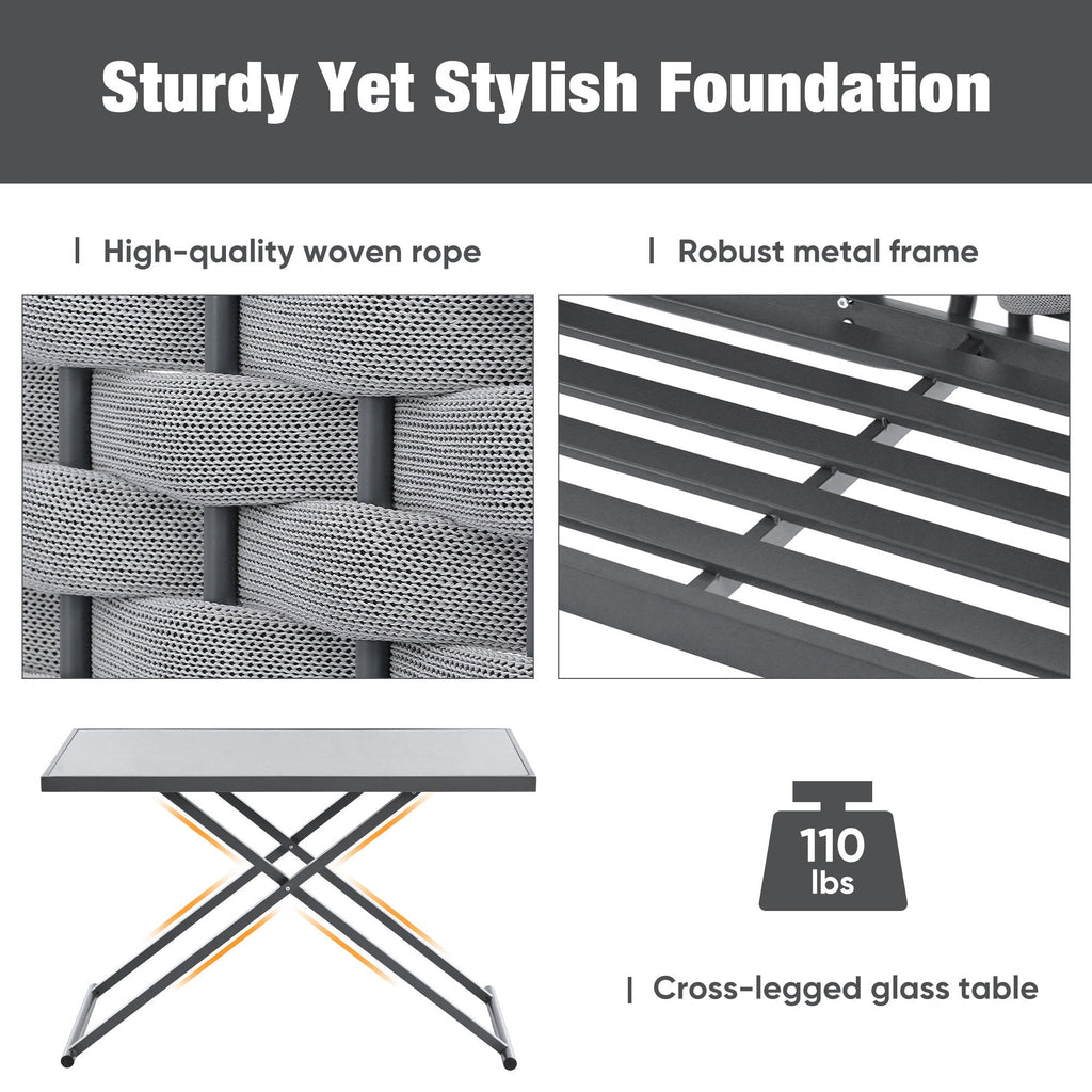 | Summary | Looking to turn your backyard into the envy of the neighborhood without breaking a sweat? Our 5-piece sofa set is your answer! Designed to comfortably seat up to 7 people, it boasts a durable metal frame, chic woven rope, and allows for various configurations. This ensemble includes 3 loveseats, 1 corner sofa with ergonomically curved backrests and armrests, plus a fashionable glass table with cross legs. It's accessorized with 8 pillows and 4 cushions, all featuring water-resistant, all-weather fabric with removable and washable covers, in 2 stylish colors. Perfect for any outdoor gathering! |