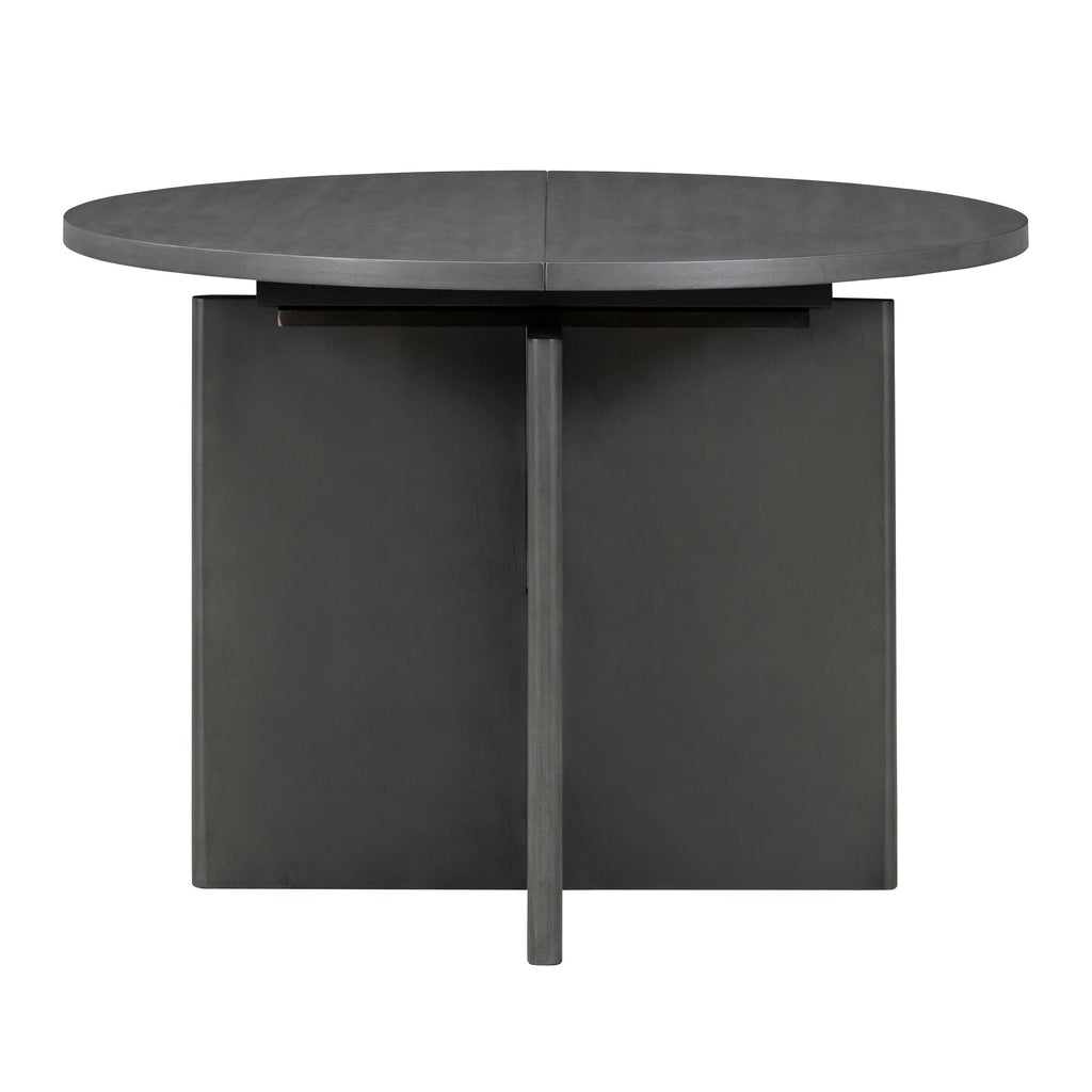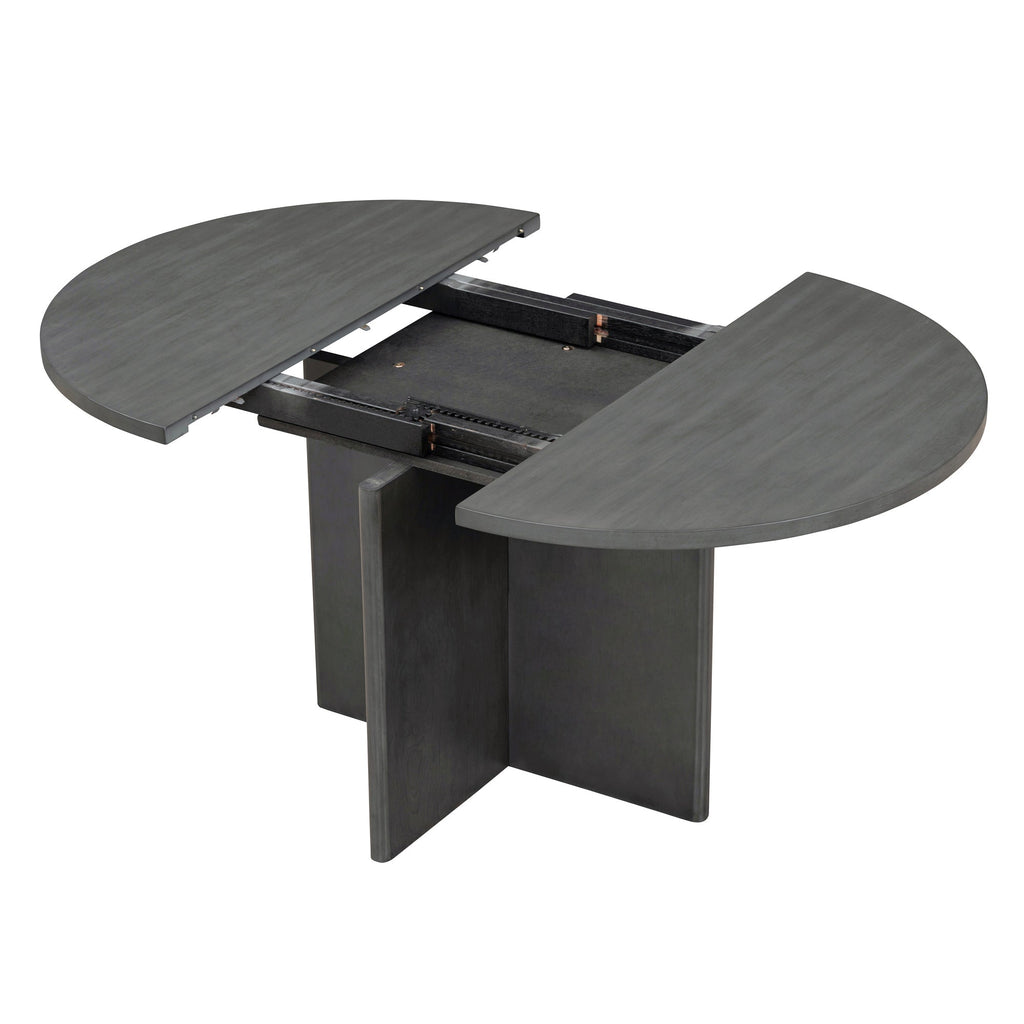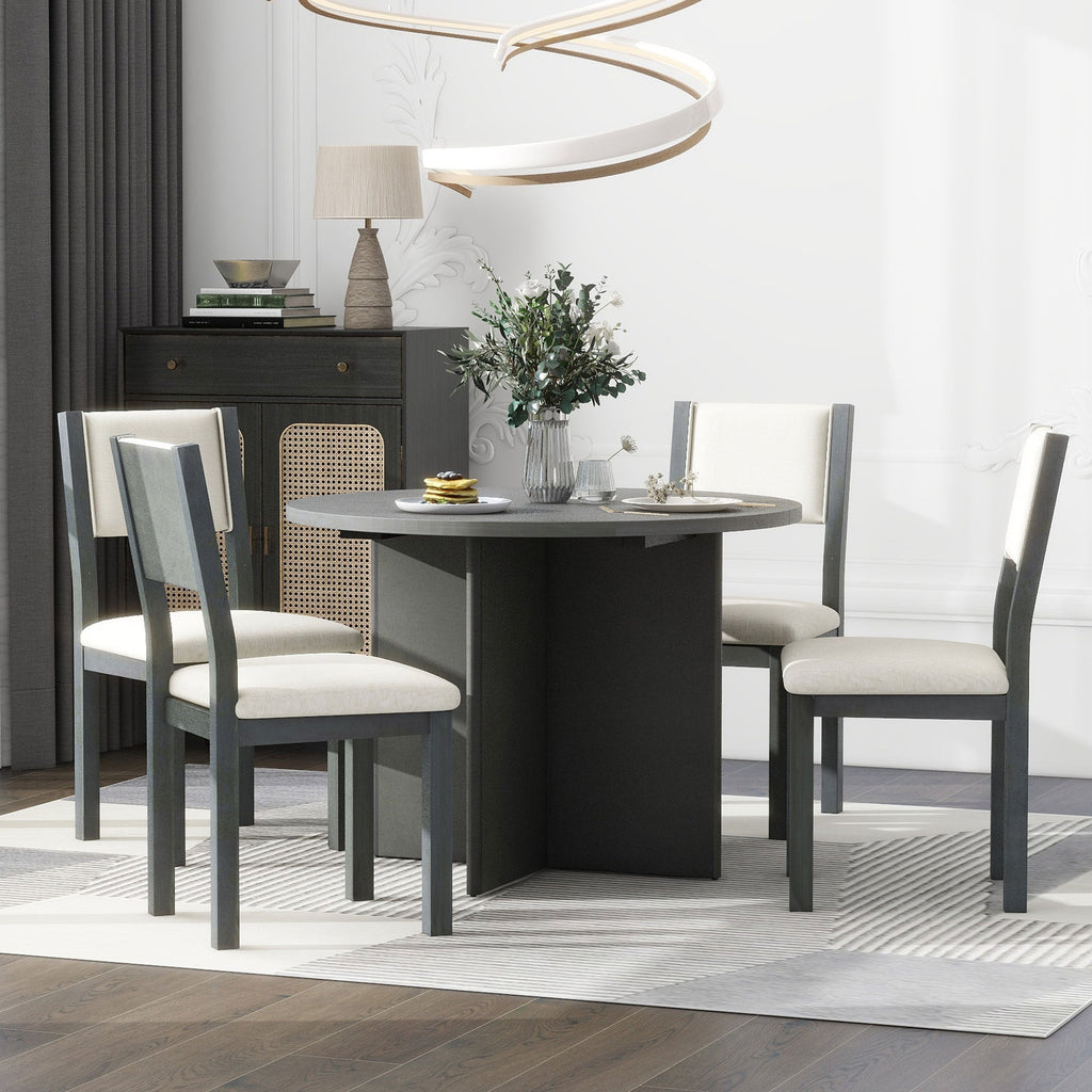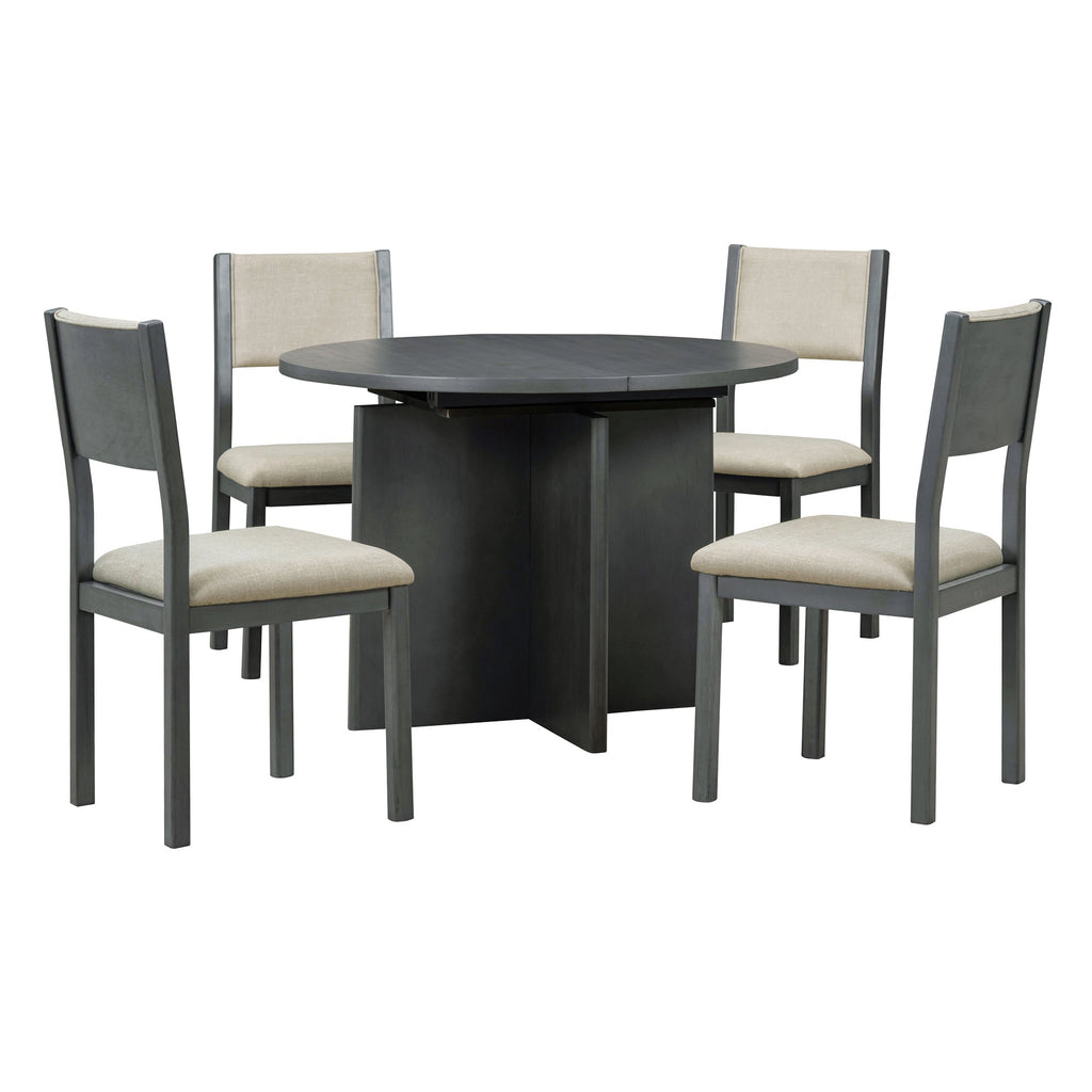 The design-inspired dining set consists of an extendable round table and four matching upholstered chairs, blending understated elegance with a rich vintage feel. It's available in two colors, natural and gray. No matter which color dining set you choose, it will add a rich vintage vibe to your home decor, perfect for use in the kitchen, dining room or living room.