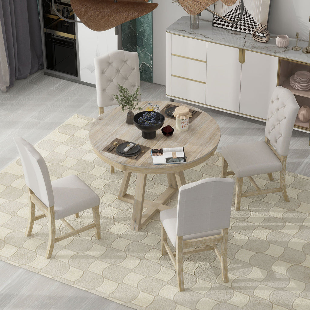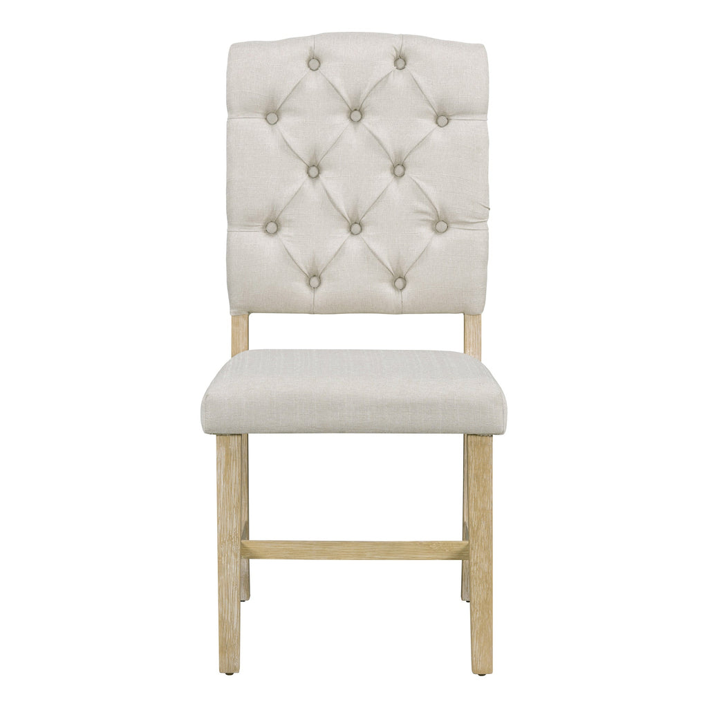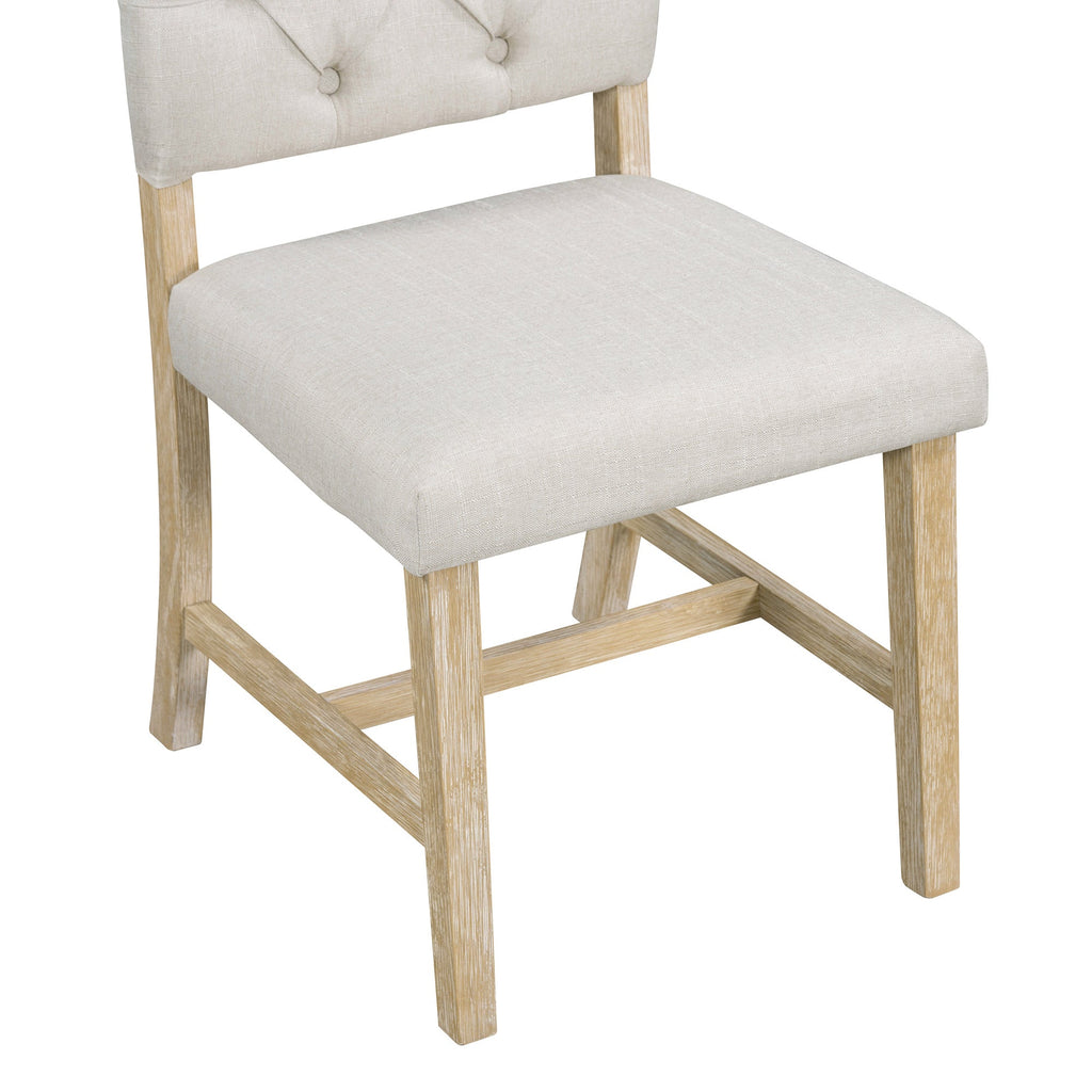 - Multi-step finish system highlights the natural beauty of the acacia wood veneer of the tabletop. The cross-shaped legs make the table look a bit like a scale from the front. Also about the dining chair set, its beautiful lines, back flared legs and delicate button tufting details are elegant and thoughtful in design. No matter where it is placed, it will become an eye-catching ornament in your dining room or living room.