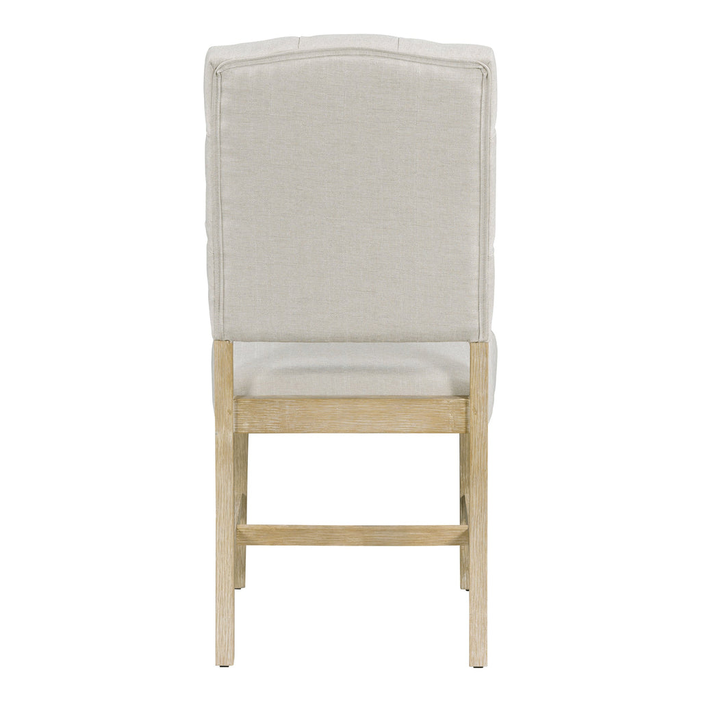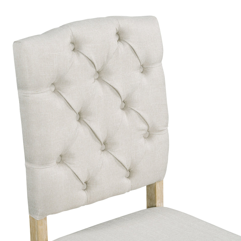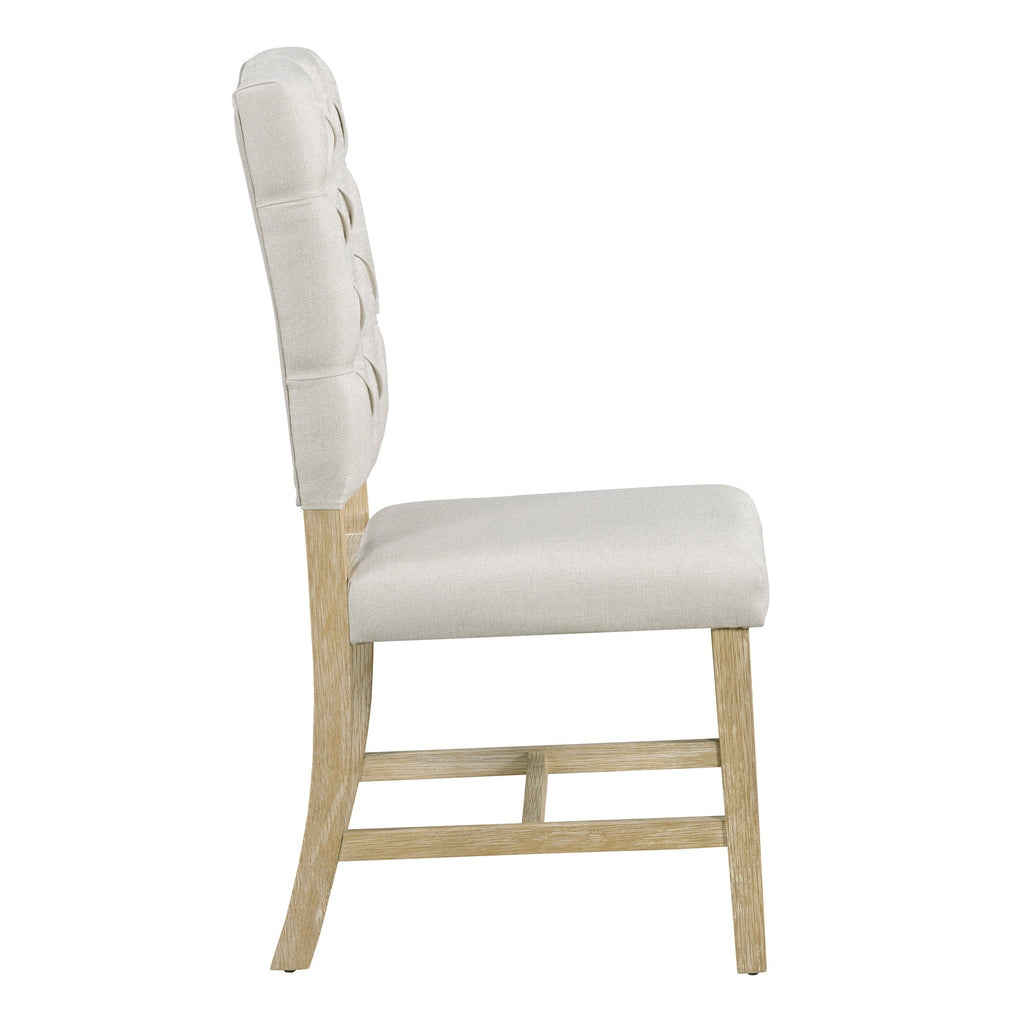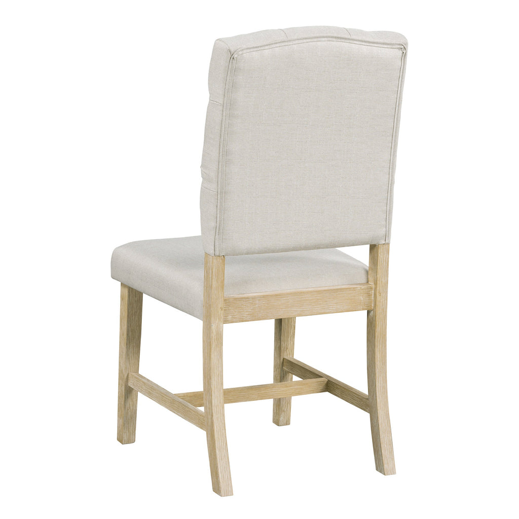 - Multi-step finish system highlights the natural beauty of the acacia wood veneer of the tabletop. The cross-shaped legs make the table look a bit like a scale from the front. Also about the dining chair set, its beautiful lines, back flared legs and delicate button tufting details are elegant and thoughtful in design. No matter where it is placed, it will become an eye-catching ornament in your dining room or living room.