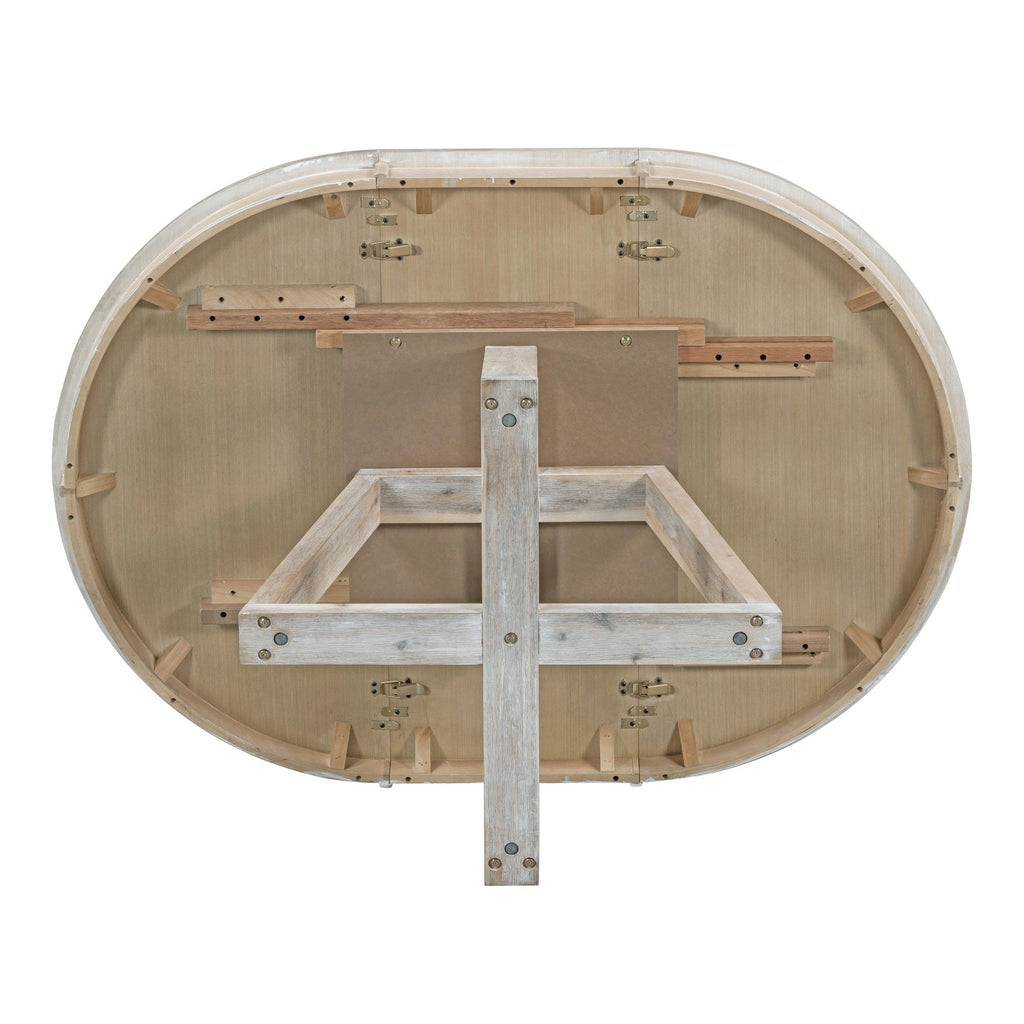 The round dining table comes with a 16 inch leaf to create an oval dining table, which can meet different needs of different lengths of use purposes. The total length of the dining table is 58", and the length of it when the board is removed away is 42". With the movable leaf's benefit, the tabletop can be adjusted from round to oval in shape, thus enhancing many functions in daily use.