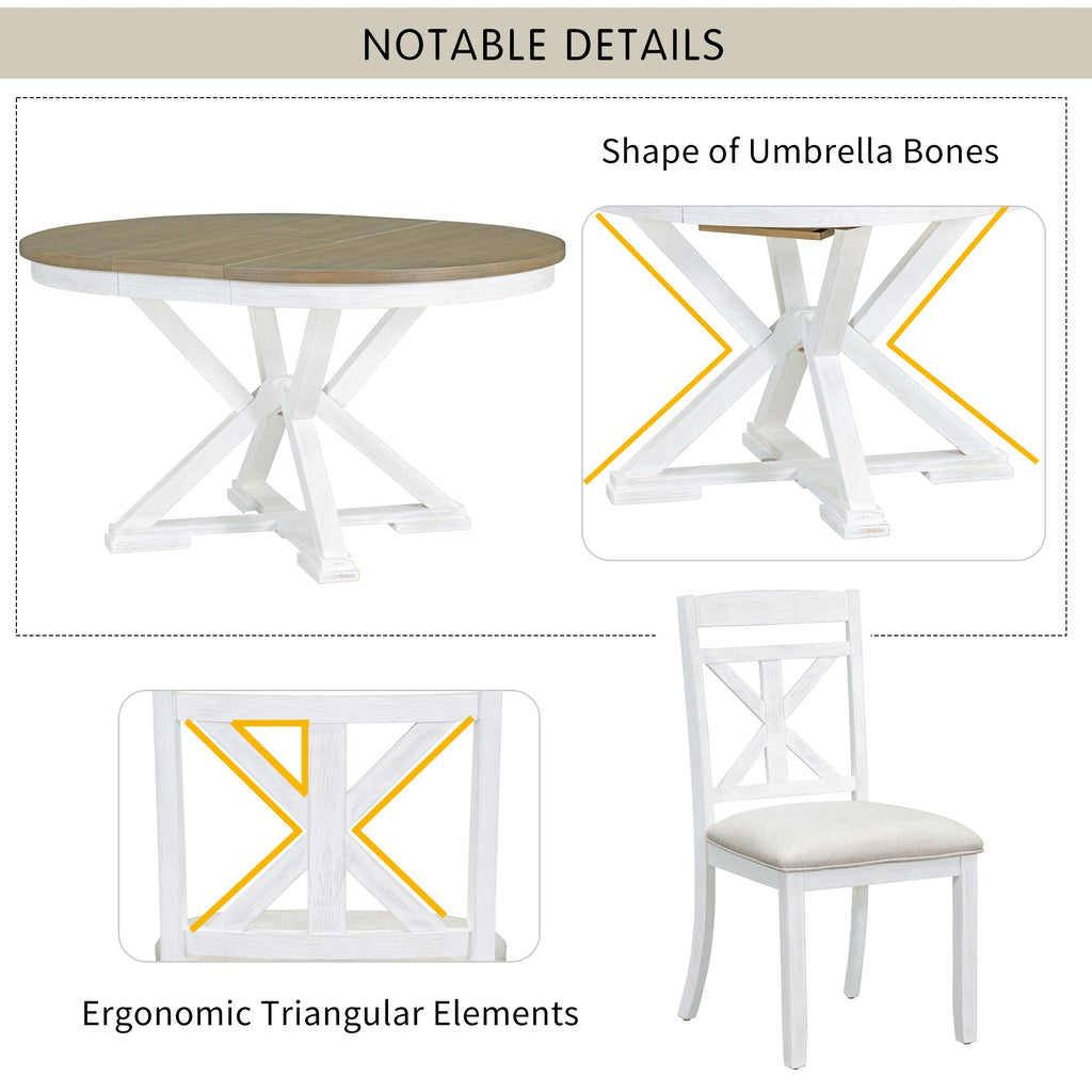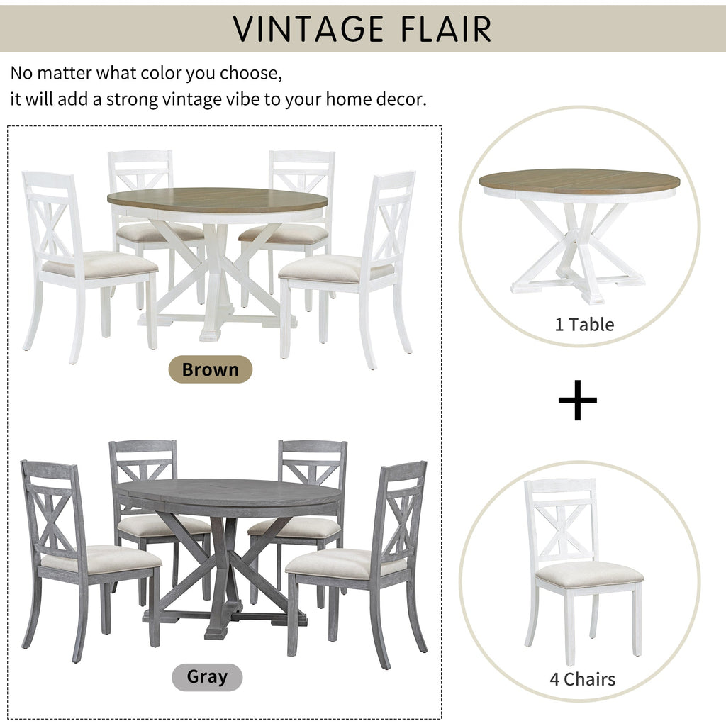 5-Piece Retro Functional Dining Table Set Extendable Round Table and 4 Upholstered Chairs for Dining Room and Living Room (Brown+Antique White)