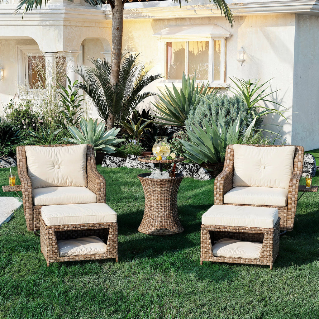 - [Sturdy & Durable]These high-quality outdoor patio swivel chairs with ottomans are meticulously crafted using hand-woven, weather-resistant PE rattan and a powder-coated steel frame. The chairs and ottoman boast an impressive load-bearing capacity of 350 lbs, while the wicker cool bar table can support up to 176 lbs, ensuring exceptional sturdiness and durability for extended outdoor use.