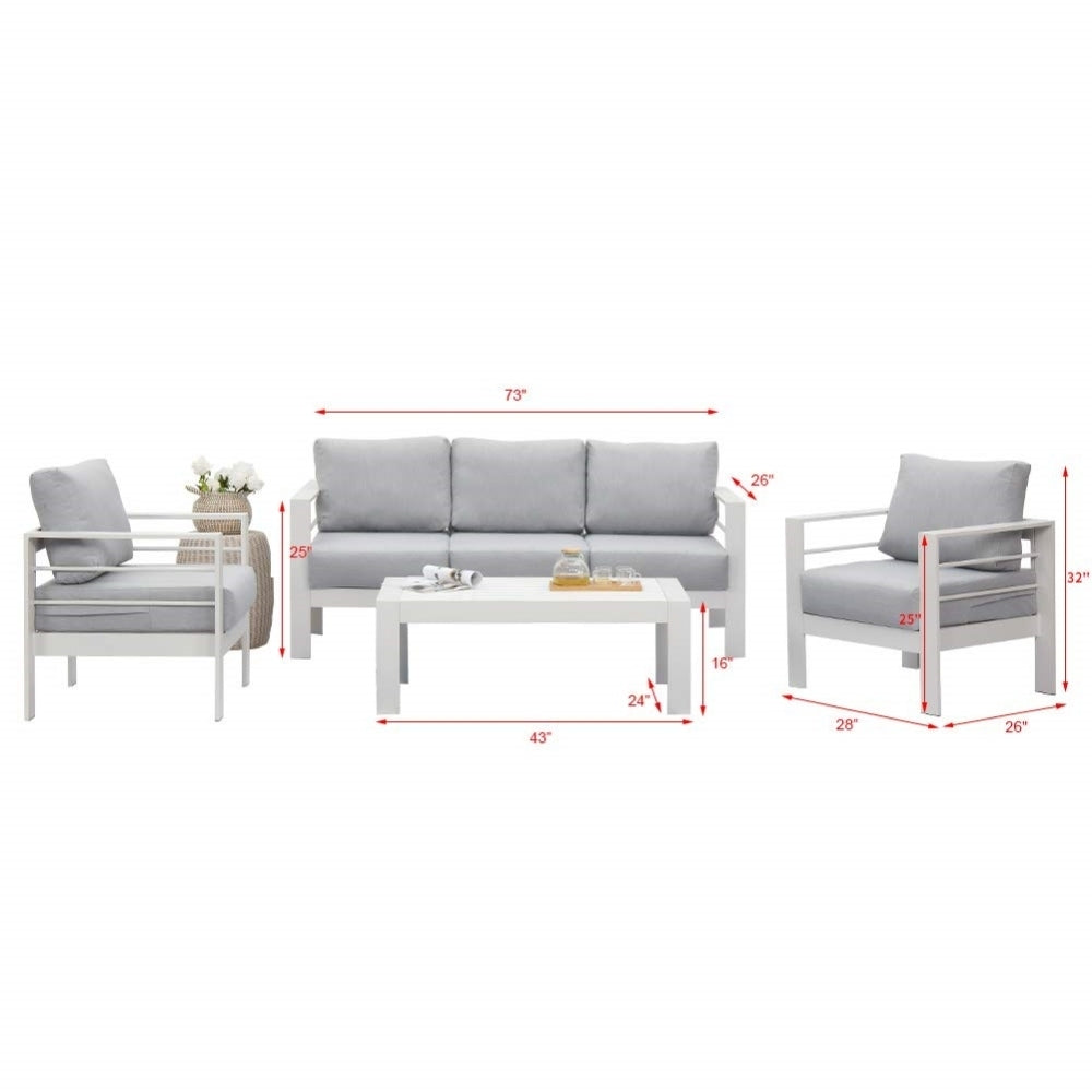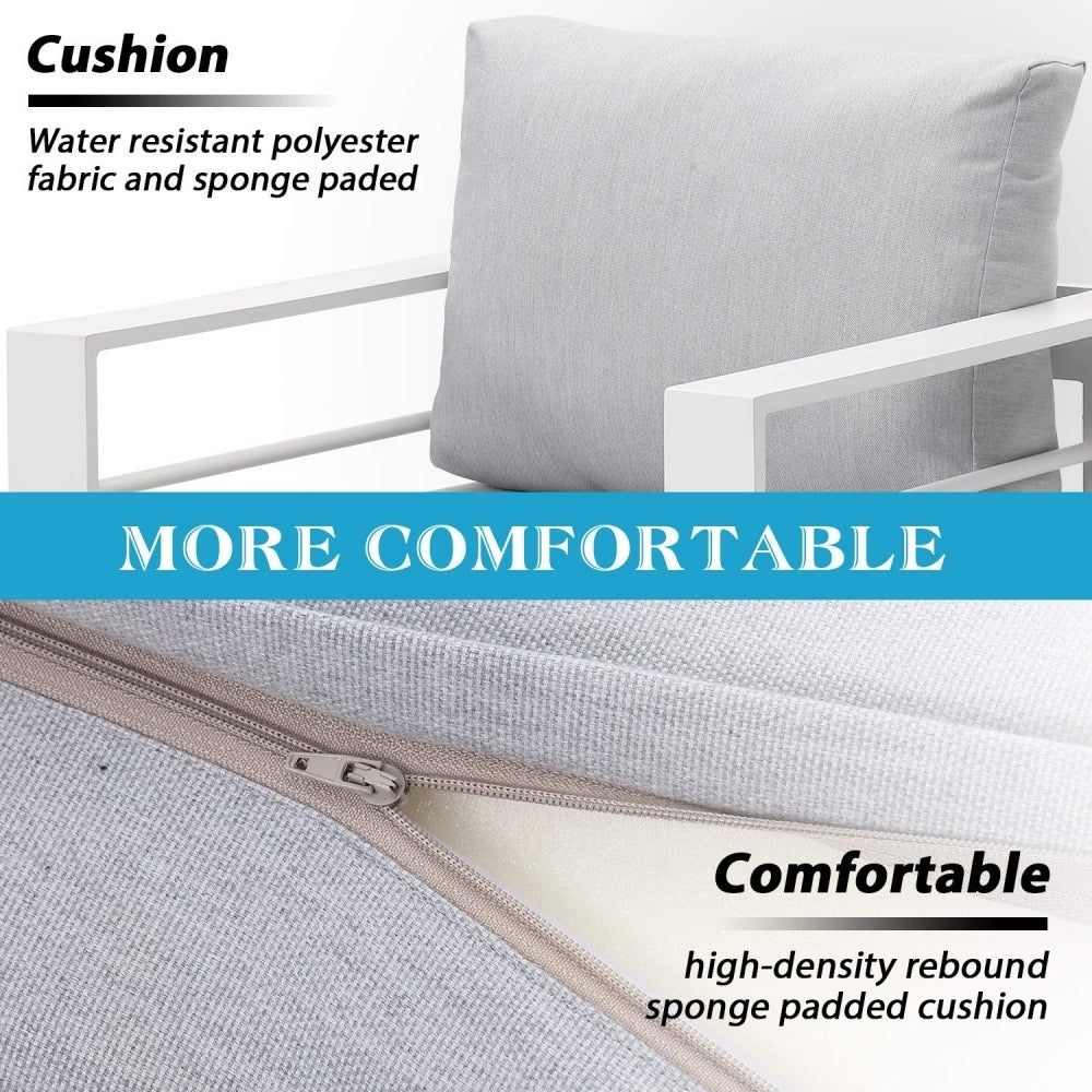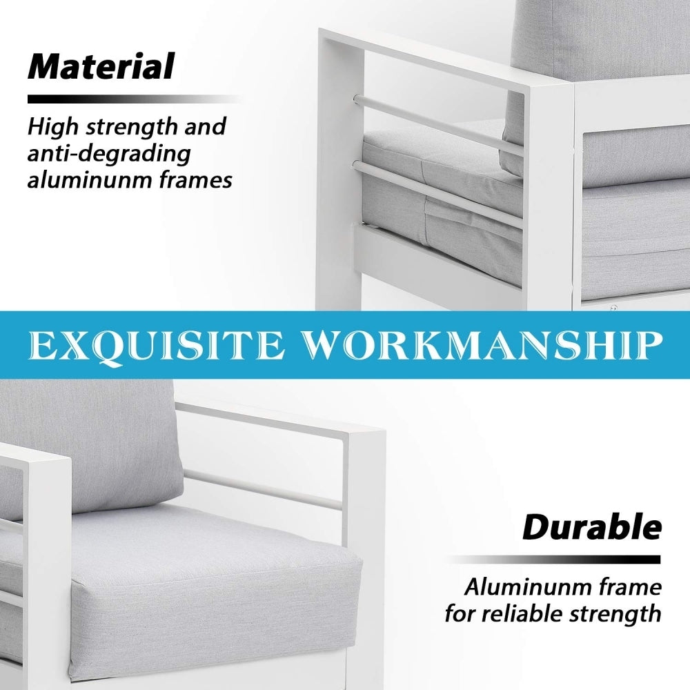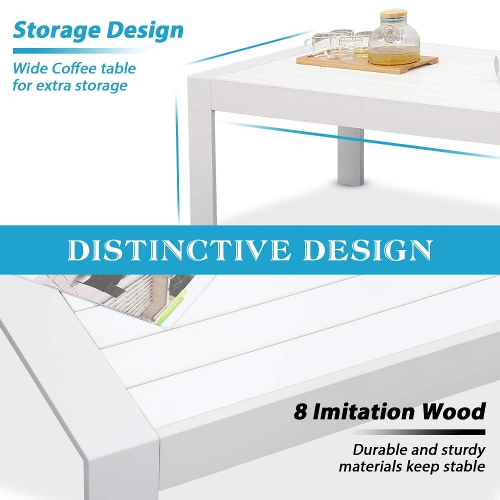 Product Design:Clean lines and wide-plank design mark the captivating aluminum outdoor patio set. The sturdy broad armrest and backrest are designed for better upper-body support. The WIDE baseplate that's tightly lined up and 4 flat & wide reinforced legs of the patio furniture sofa ensures a sturdy construction and large capacity that goes as high as 300 lbs per seat.