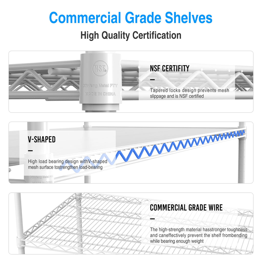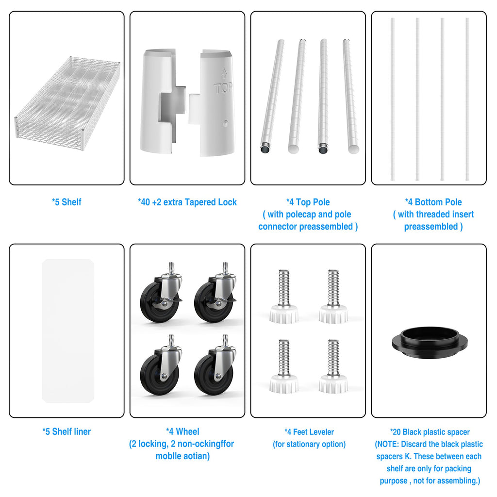 [5 TIER LARGE CAPACITY] - Heavy duty shelving with leveling feet - each layer shelf can hold 1500lbs (evenly distributed), maximum load capacity is 7500lbs. It is recommend that heavy items on the bottom shelf for maximum stability. 5 shelf Liners choice of beautiful and fun transparent colors allow you to add a pop of color to your life. Shelf liners is waterproof - Won't get damaged from exposure to moisture. [STURDY & EXTREMELY DURABLE] - Wire shelving made of heavy steel, it has excellent rust resistance and oxidation resistance. Our wire shelf liner is crafted to provide unparalleled quality, longevity, function and beauty. Better quality thicker than the competition. The 5 tier shelf unit passed NSF certified, safe and reliable. Storage rack are perfect addition to home, office, garage. [ADJUSTABLE DESIG] - Each shelf can adjustable in 1-inch increments, adjust the shelf height according to size of the item, meet your different needs, get the best utility shelf. Create two new shelf by splitting the top pole, you can split it according to your actual needs and achieve multiple uses. [EASY MOVEMENT] - 5 tier garage shelves have 4 leveling feet, 4 4-inch industrial wheels(2 lockable). Wire rack on wheels can be easily positioned in supermarkets, garages, closets, kitchens, porch, pantry, etc. Height-adjustable leveling feet can be placed on uneven ground- simply twist to stabilize. Non-slip, will not scratch ground. [EASY TO ASSEMBLE] - With detailed instructions and no tools required, you can install it easily with another person within 15 minutes. There are many parts in the package, please feel free to contact us via buyer message if meet the case of missing parts and assembly.