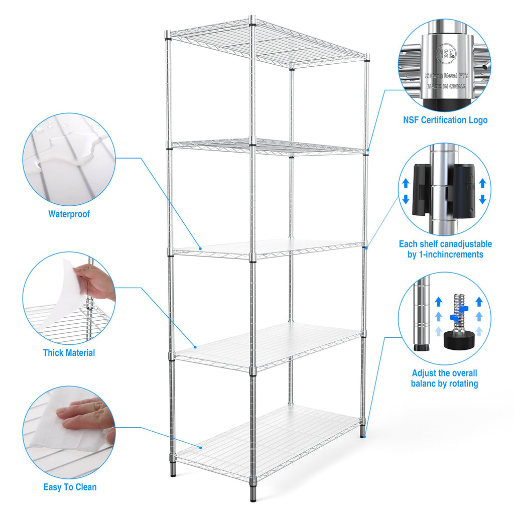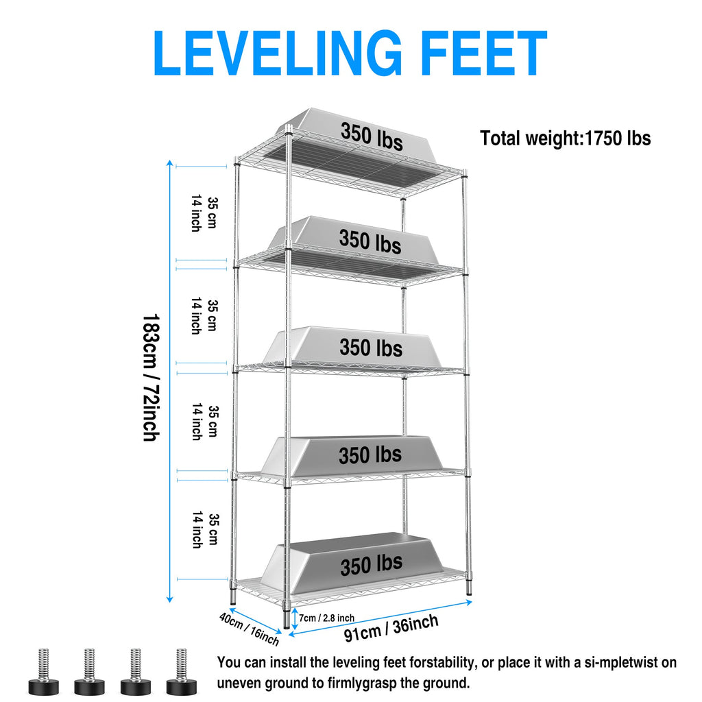 - Heavy duty shelving with leveling feet - each layer shelf can hold 350lbs (evenly distributed), maximum load capacity is 1750 lbs.