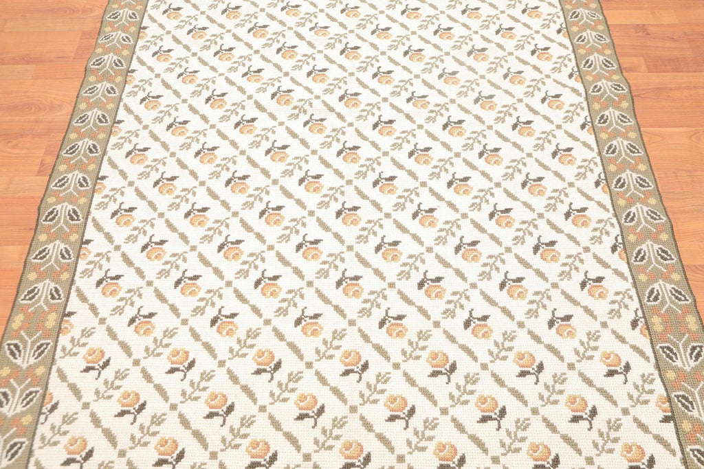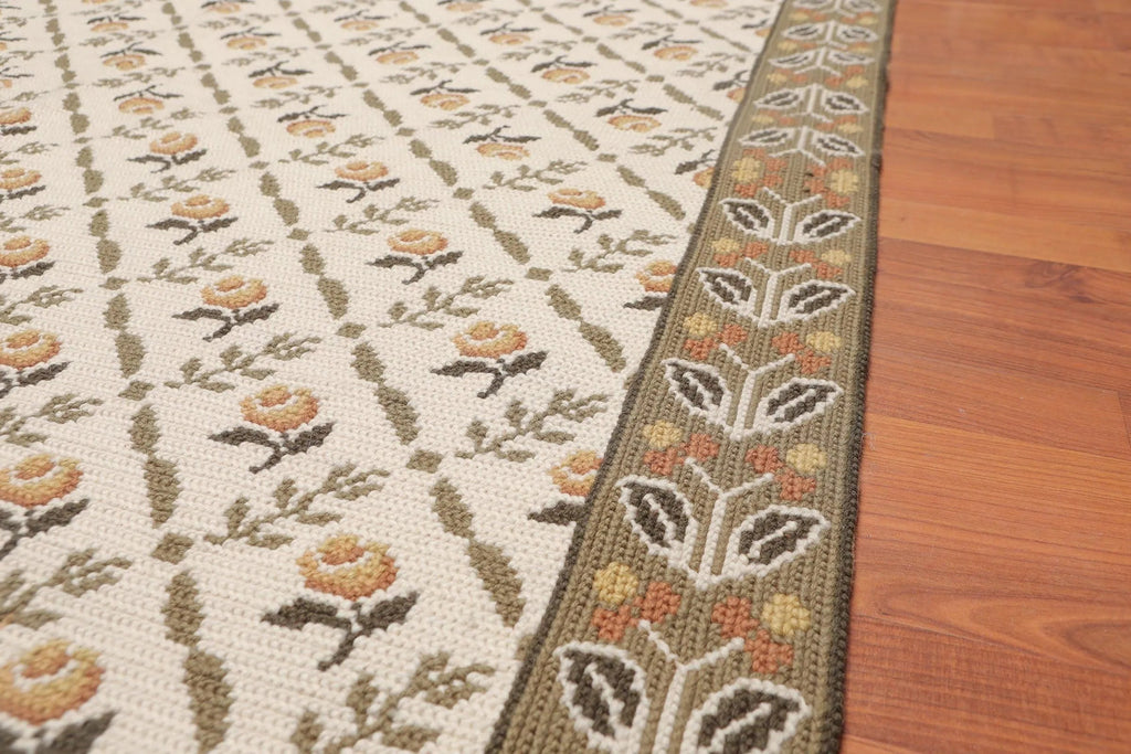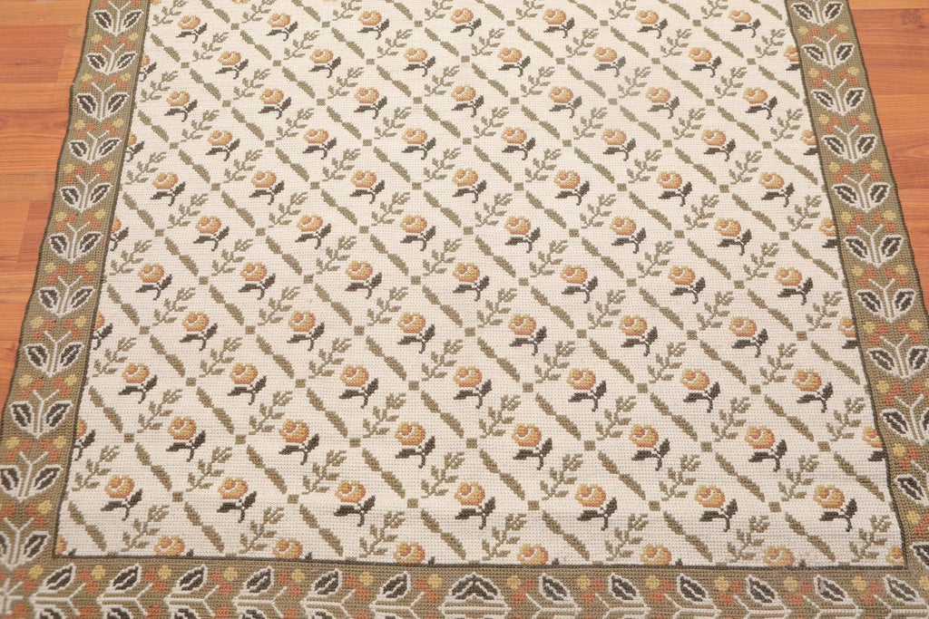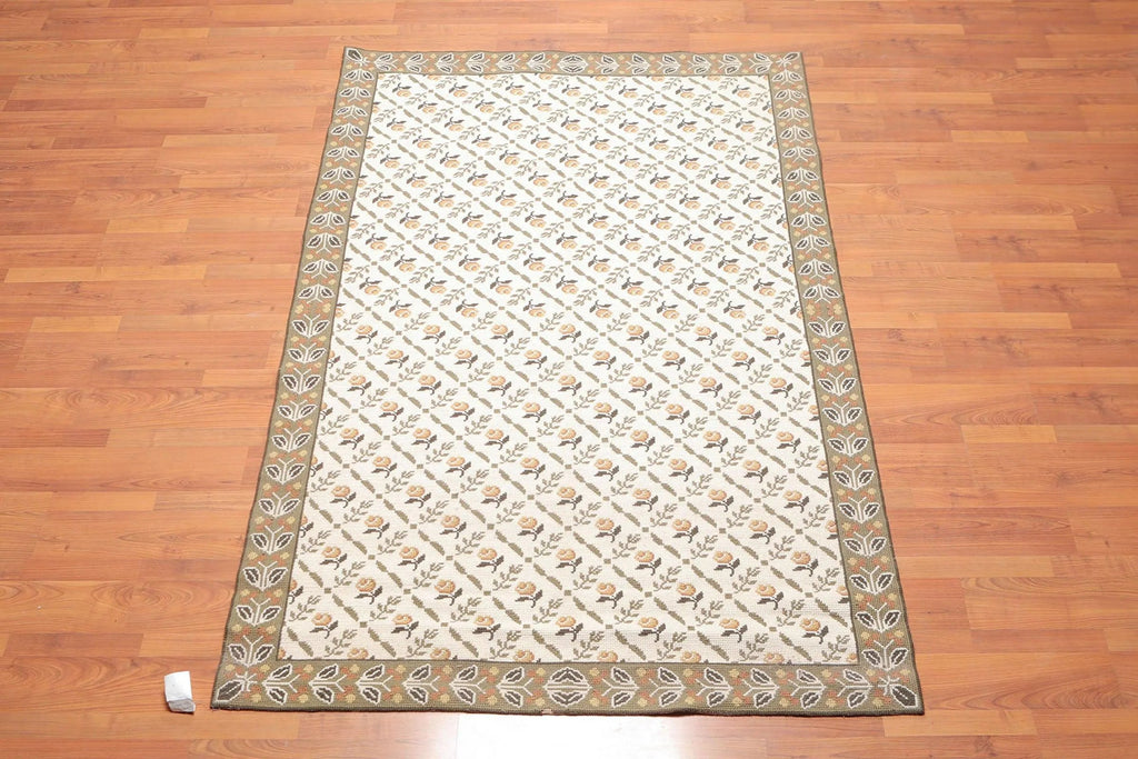 This is a beautiful Beige, Sage, Brown, Gold, Multi Color Hand Woven French Needlepoint Area Rug 100% Wool Rug. Its elegant style is easy to decorate with and perfect for living room, dining room, bedroom or anywhere in the residence or office. This Aubusson is 100% wool in thin pile. Rugs and tapestries were made famous during 14th and 15th century and were made in Aubusson, a small medieval town in France. The rugs have motifs in traditional design. During 1930s tapestry was made popular by artists such as Cocteau, Dufy, Dali, Braque, Calder and Picasso who were invited to Aubusson to express themselves through the medium of wool.