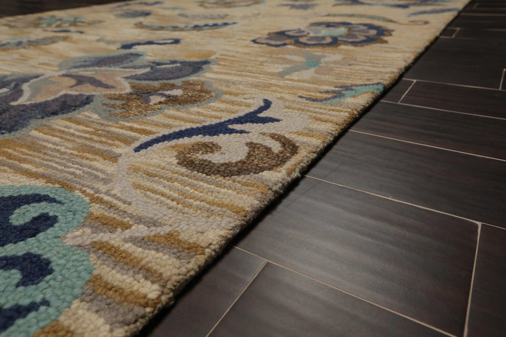 This is a beautiful Beige, Gray, Turquoise, Blue, Brown, Multi Color Loop Pile Floral Hand Tufted Persian Oriental 100% Wool Rug. Its elegant style is easy to decorate with and perfect for living room, dining room, bed room or anywhere in the residence or office.