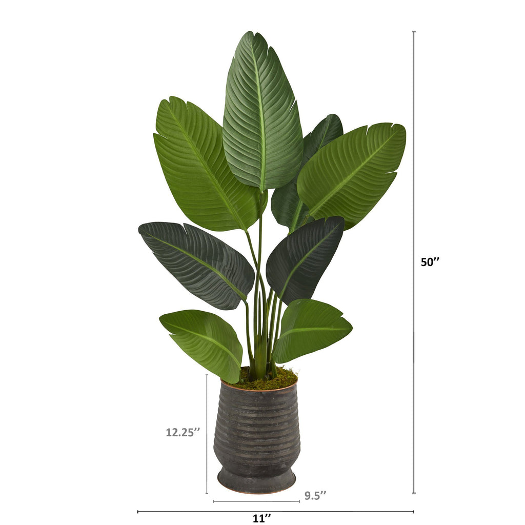 Brighten up bare spaces in your home or office with the help of this artificial tree showcasing intricately designed travelers palm leaves that naturally fan upwards and outwards, handsomely accented with hints of explosive coloration and natural detailing. Standing 50” high from a ribbed metal planter, this tropical-inspired fake tree provides year-round freshness wherever displayed.