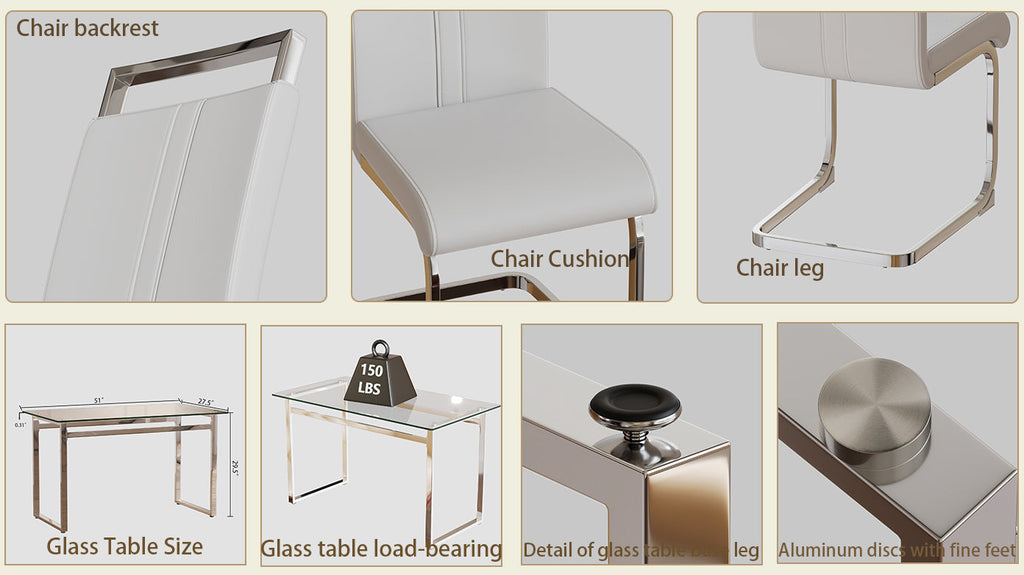 51 inch Glass Dining Table Set for 4, Dining Table & Chair Sets with Silver Plating Legs for Kitchen, Modern Rectangle Tempered Glass Table Top and PU Dining armless Chair for Dining Room