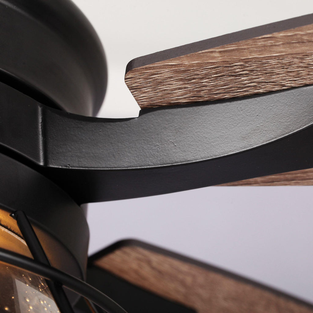 Gorgeous glasswork meets flawless vintage woodwork and ironwork in this 52-inch ceiling fan. Designed with aged iron and 5 reversible wood blades, featuring a weathered light brown distressed finish. Complemented by a rustic industrial light kit with clear glass shade, it is a farmhouse focal mood point for any living space.
