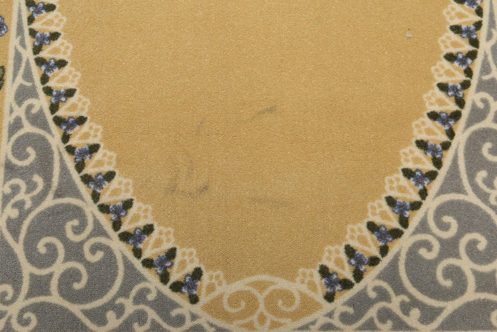 This is a beautiful 5'4"x7'8" Gold, Gray, Green, Blue, Multi Color Machine Made Polypropylene Indonesian High Density Hand Carved Effect Modern Oriental Rug With Some Stain. Its elegant style is easy to decorate with and perfect for living room, dining ro