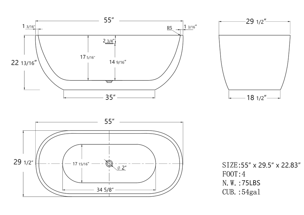 55 inch length and 14-9/16 inch soaking depth of this acrylic free standing tub allows for a deep soak but less space occupation. Streamlined form gently sloping ergonomic design white soaking tub following the natural curves of your body to provide exceptional comfort,full support your back and lumbar to enjoy a relaxing soak in our free standing tub.