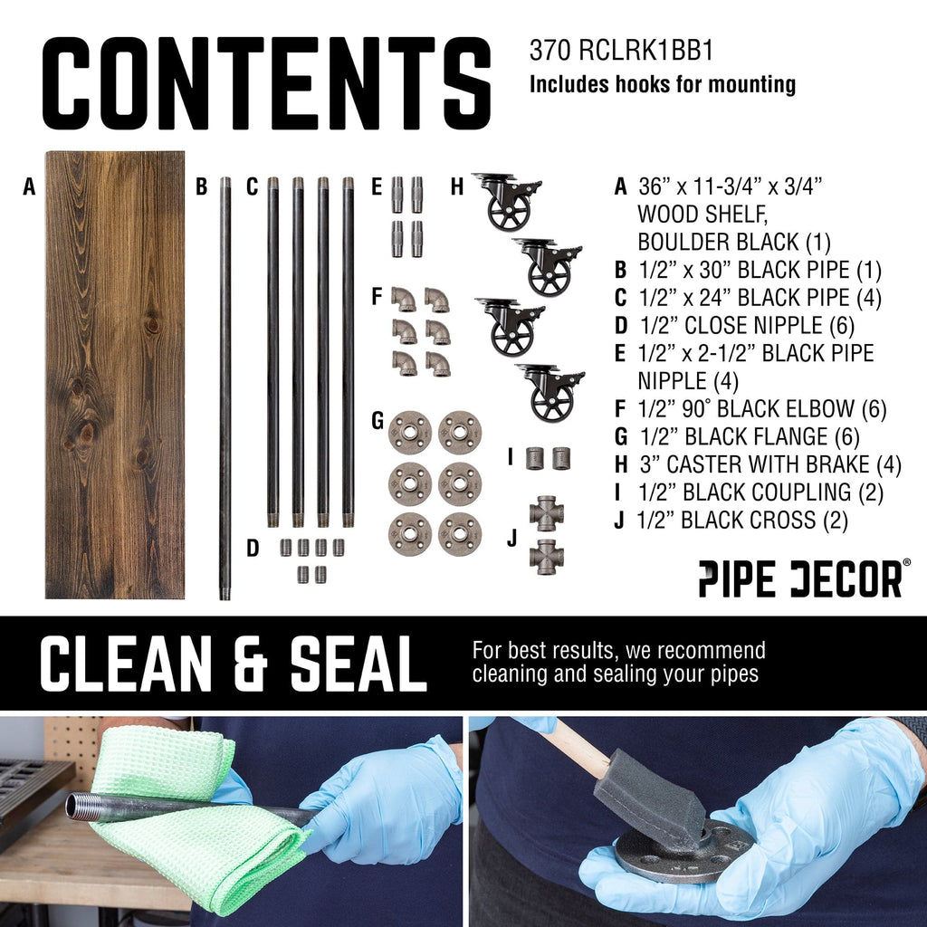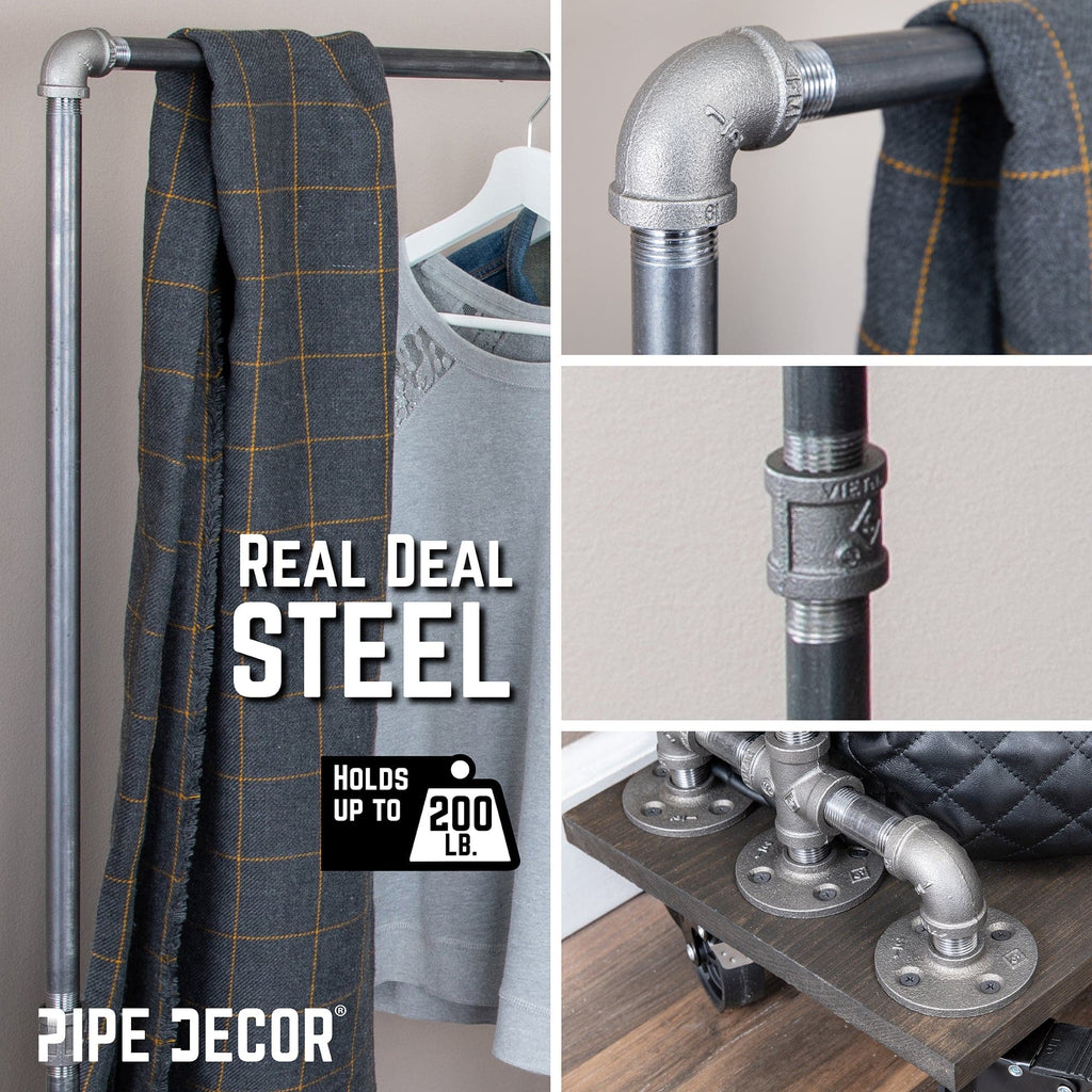 Minimalist design meets maximum functionality. Our rolling wardrobe is the perfect way to display your unique fashion sense in your home or retail space. Mix and match with other DIY pipe furniture kits to create the open wardrobe of your dreams. This easy-to-assemble wheeled clothing rack will have your room looking organized in no time. Use it in the bedroom or turn it into a convenient coat hanger for your guests in the living room. Not only is it good for home use, but this versatile rolling wardrobe can also be used in your business. It’s great for displaying clothing in a boutique or shop. An industrial clothing rack is a great way to showcase your unique fashion and keen eye for modern design. This is a great option for those short on storage space. The height provides ample hanging space from the top bar to accommodate dresses, pants, and more. The bottom shelf is real, solid wood—perfect for storing shoes, baskets, bins, and other accessories. The caster wheels have a 360-degree swivel supported by sturdy ball bearings, so you can smoothly maneuver into tight spaces with no squeaking noise and no floor scuffing.