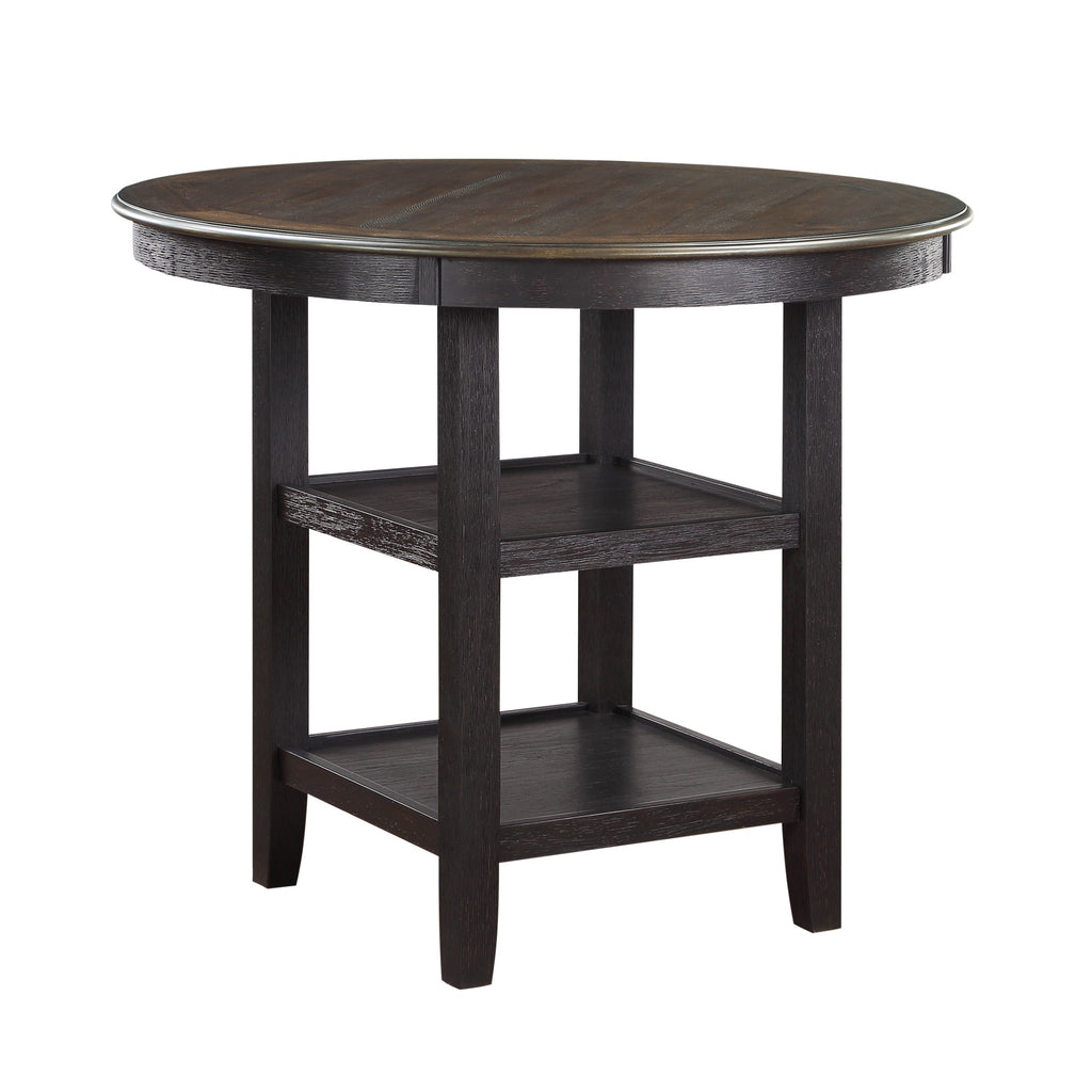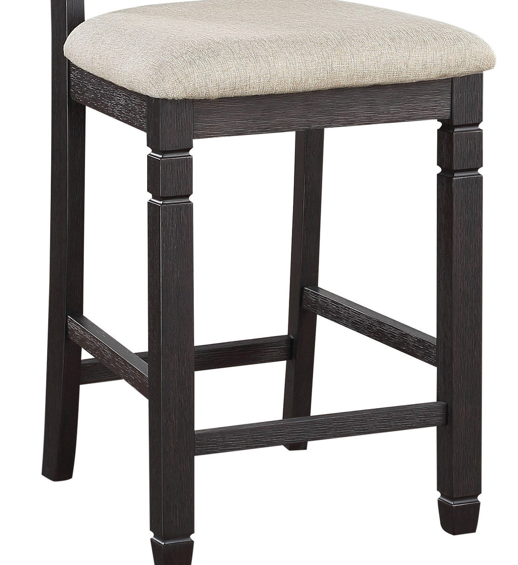 PRODUCT FEATURES: - • Country of Origin: Vietnam • Made of acacia veneer, wood and engineered wood • 2-tone finish (brown and black) • Base with built-in shelves • Seats 4 • Counter height design • Fabric upholstery • Fabric Type: Textured • Fabric Color: Beige • Fabric Content: 100% polyester • Fabric Cleaning Code: Upholstery (S) PRODUCT DESCRIPTION: - The transitional style of the Asher Collection creates a versatile platform to inspire your casual dining room décor. The round counter height table’s support base features a display shelf that allows for quick and open access to your tabletop accessories. The brown and black finish over acacia veneer serves to highlight the wood’s grain while allowing for maximum versatility in decorative accenting. The coordinating wood-framed counter height chairs feature beige fabric seats for complementing contrast. PRODUCT DIMENSIONS: - Counter Height Table: 42" Dia x 36"H Apron to floor: 33" Shelf interior: 19" x 19" x 11.5" (2) Counter Height Chair: 18.5" x 22" x 42.5"H Seat Width: 18.5" Seat Depth: 17.5" Seat Height: 25.5" Listing Includes: - 5pc Dining Set (1 Counter Height Table and 4 Counter Height Chairs) Only. Simple Assembly Require. Shipment Service: Shipping Service Include Curb Side Delivery with Free Lift Gate Service. NOTE: No Inside Home Delivery.