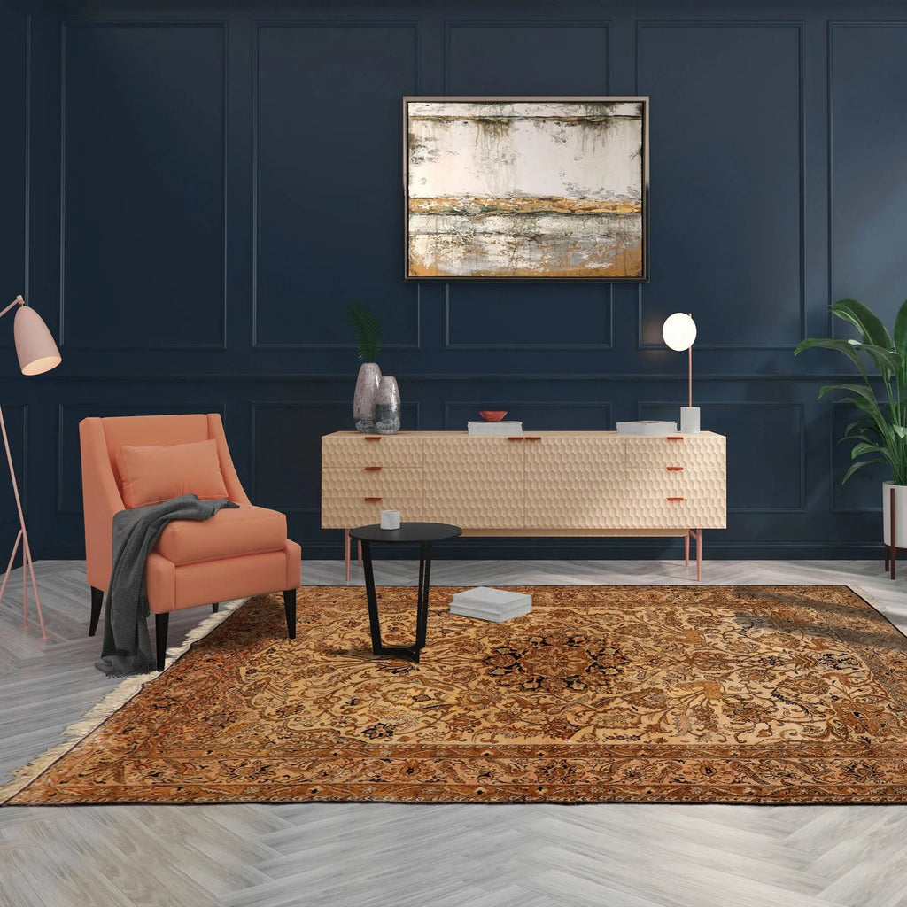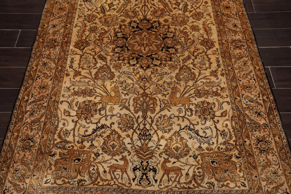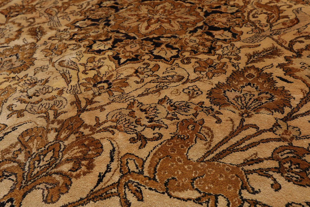 Heirloom Quality! The Qum rugs from the eponymous region of Iran are famous for their exceptional mastery of silk-on-silk foundation. This is one of a kind rug with pictorial fauna and botanical elements both in the inner field as well as the border. Because of the silk threads used in pile and fine weaving techniques, the rug has designs that are intricate and thoroughly detailed. This rug is a collector’s delight!