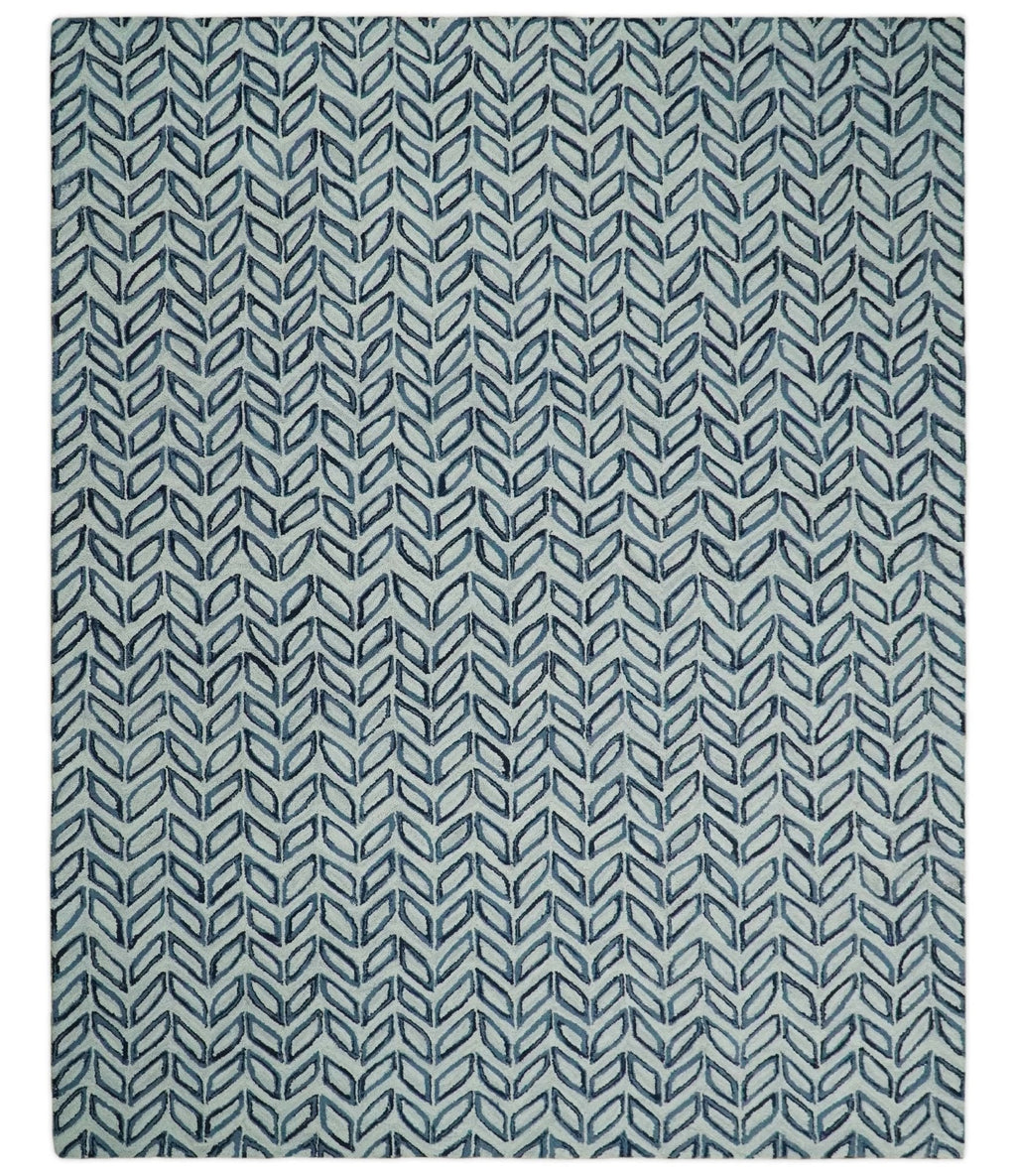 5X8 and 8x10 Contemporary Farmhouse Leaf's Hand Tufted Silver and Blue Loop Wool Rug