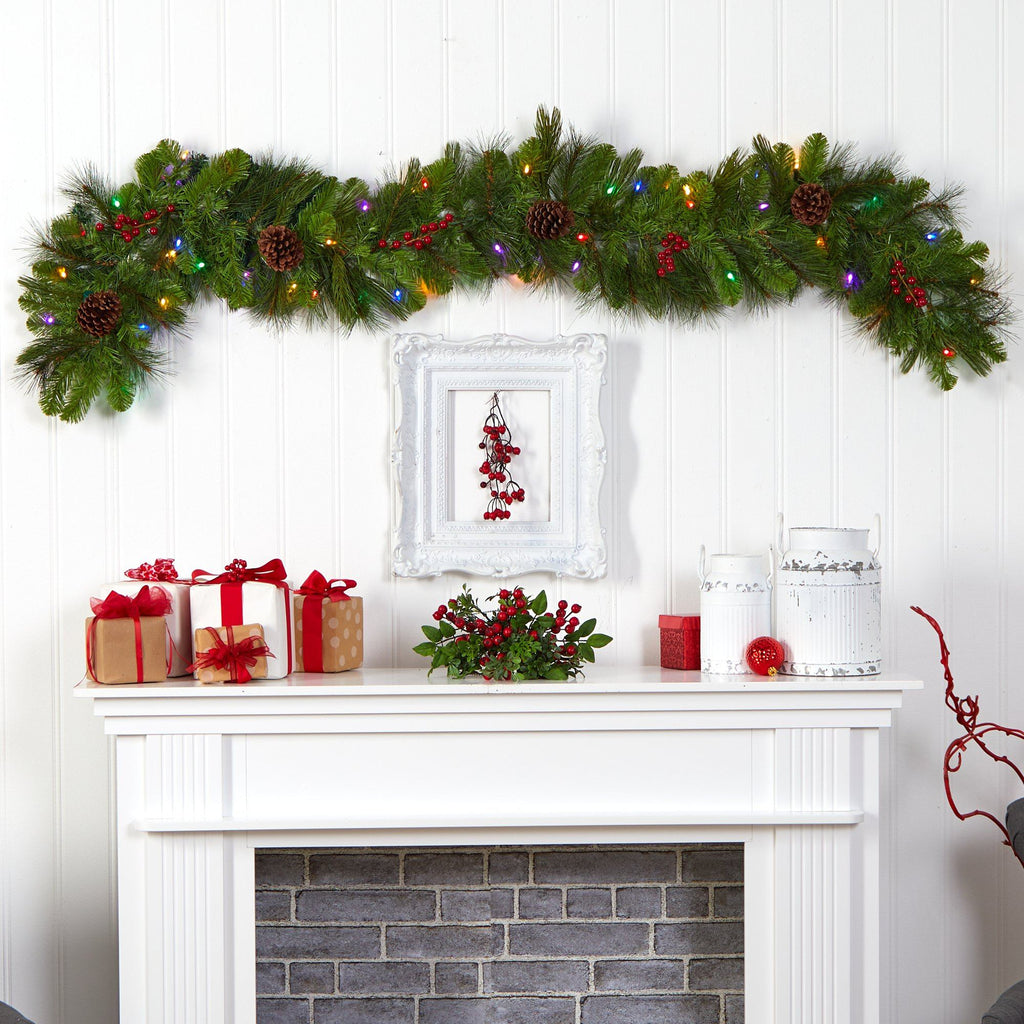 Complete your holiday decor with this artificial winter garland, designed from realistic looking pine foliage in seasonal evergreens, handsomely accented with faux pinecones and sprays of holly berries - all to evoke the Christmas spirit. The 50 multicolored LED lights will illuminate any area gracefully. Reaching 6’ long to make decorating stress-free, this artificial garland is great for mantles, counters, or banisters, and would undoubtedly complete a traditional holiday setting for years to come.