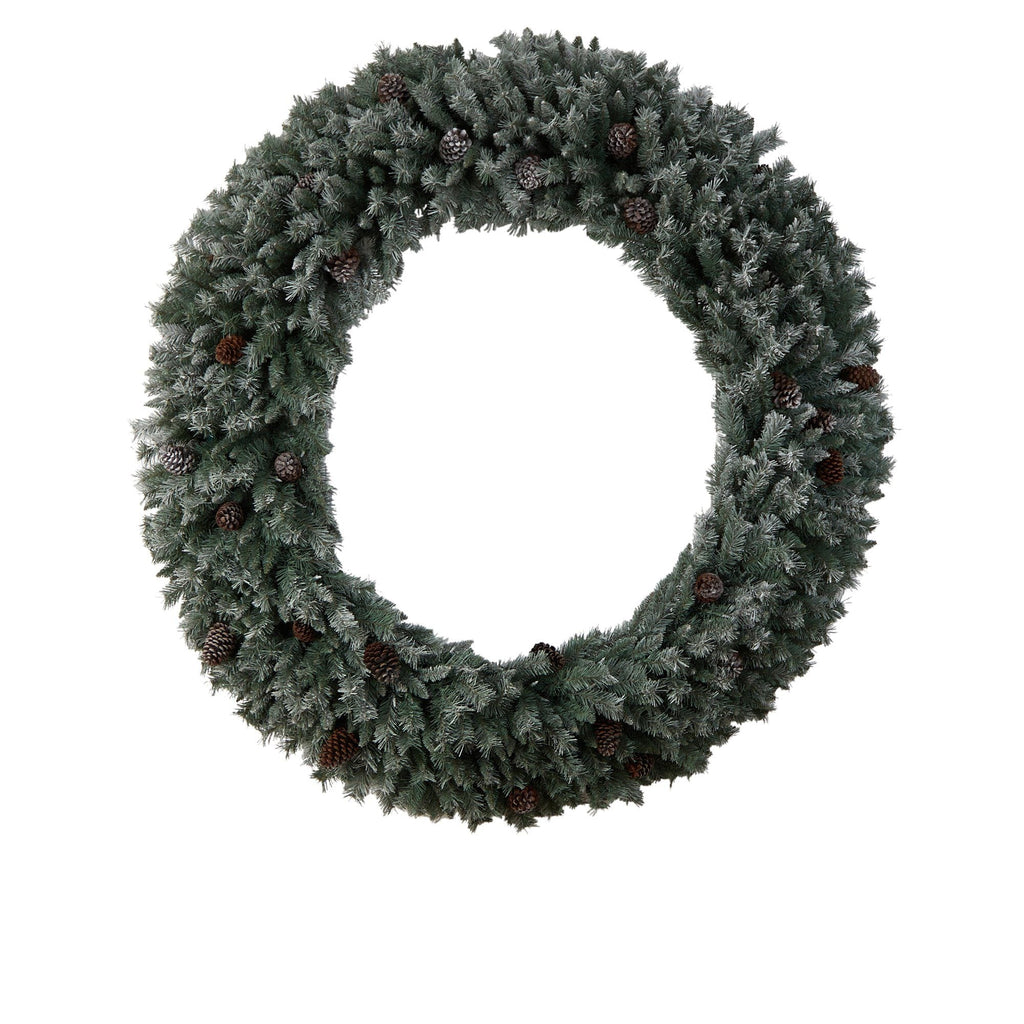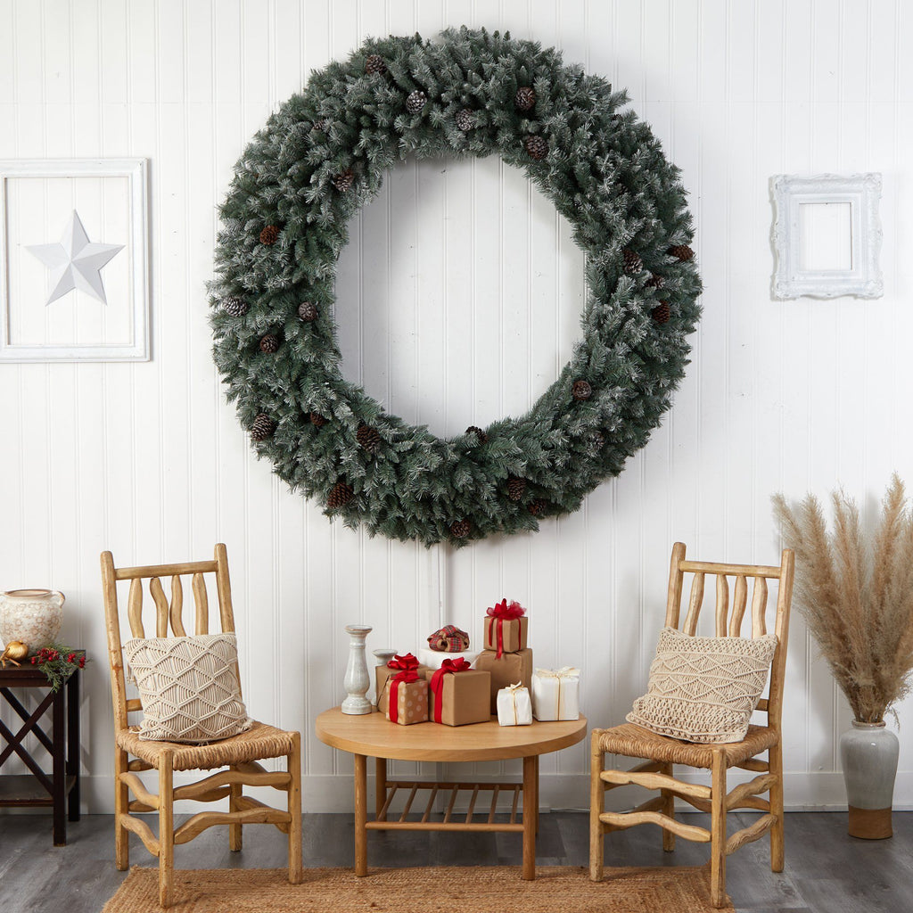 Add the WOW factor to your holiday décor with this flocked artificial Christmas wreath intricately designed from realistic looking pine foliage in a palette of seasonal evergreens flocked in a coat of faux-snow, carefully accented throughout with faux pinecones that look incredibly realistic. Arriving pre-strung with 600 clear LED lights to effortlessly illuminate either a large wall or door, this 6’ (in diameter) decorative wreath makes for an inviting accent and will undoubtedly transform any entrance all throughout the holiday season. Perfect for a large space in need of some holiday cheer.