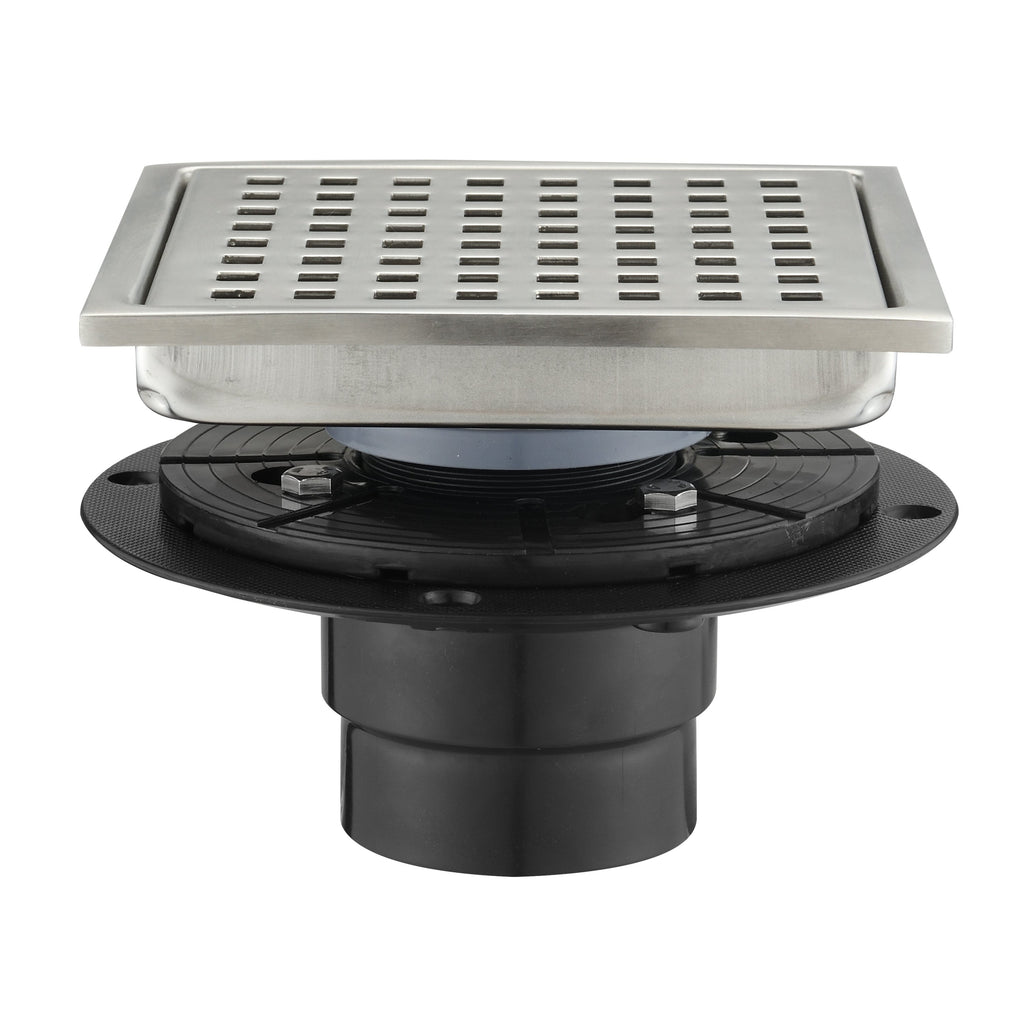 【Easy to install&Easy to clean】Square grate shower drain outlet easy to unload, fits US NO HUB Drain Base System.Can be used in kitchen, bathroom, garage, basement and toilet ;and also Preventing unpleasant smell, insects and mice from entering the house.After using for a period of time, if the floor drain needs cleaning, you only need to open it by the lifting hook, take out the filter, if there is oil stains, only need soap and water to clean it.
