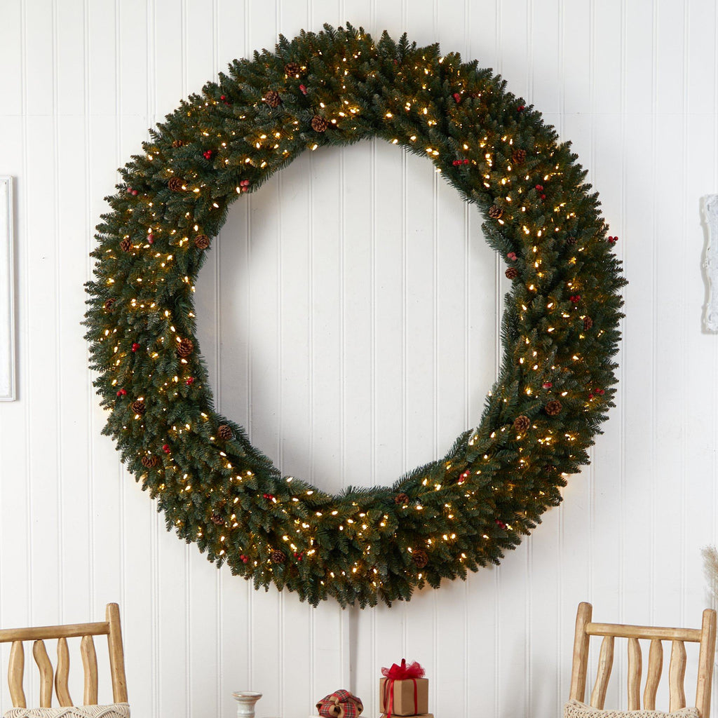 Add the WOW factor to your holiday décor with this flocked artificial Christmas wreath intricately designed from realistic looking pine foliage in a palette of seasonal evergreens flocked in a coat of faux-snow, carefully accented throughout with faux pinecones and berries that look incredibly realistic. Arriving pre-strung with 600 clear LED lights to effortlessly illuminate either a large wall or door, this 6’ (in diameter) decorative wreath makes for an inviting accent and will undoubtedly transform any entrance all throughout the holiday season. Perfect for a large space in need of some holiday cheer.